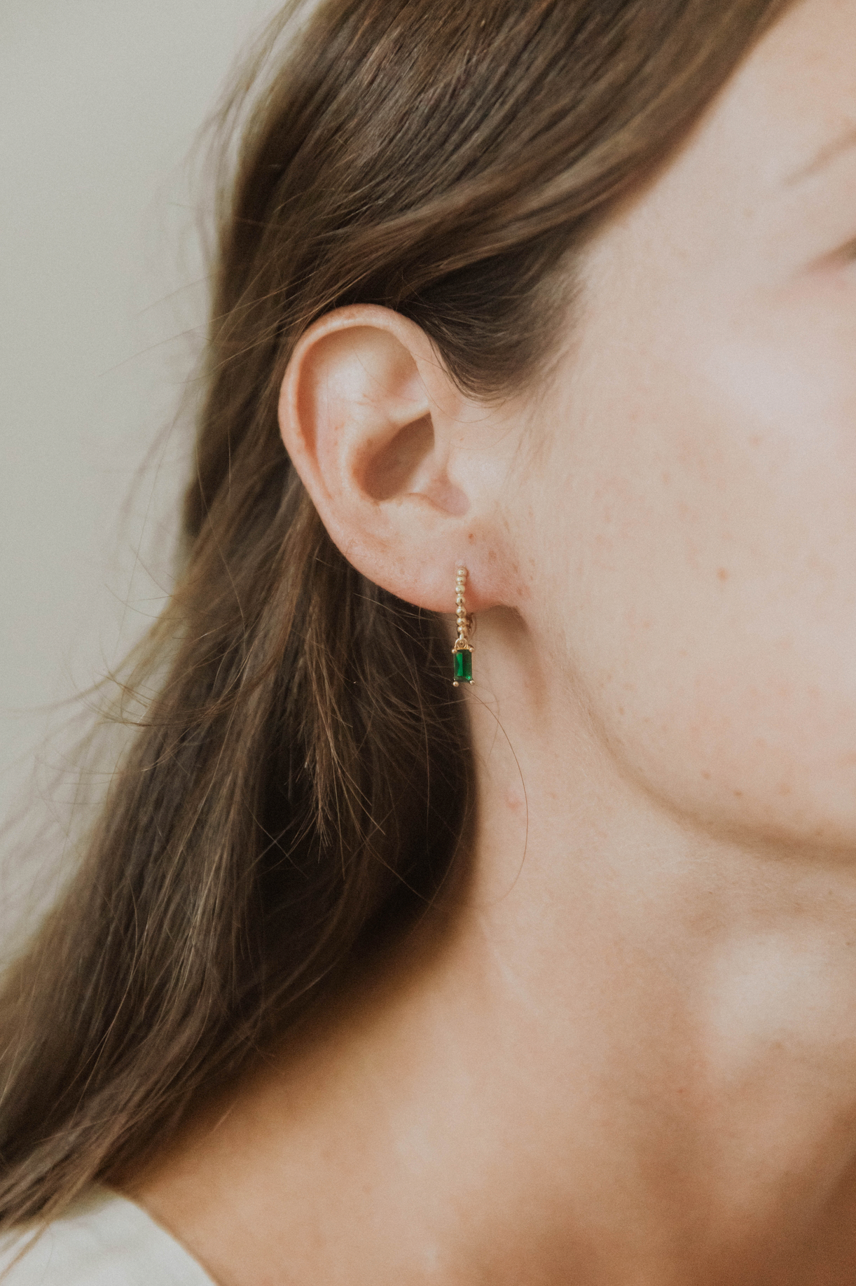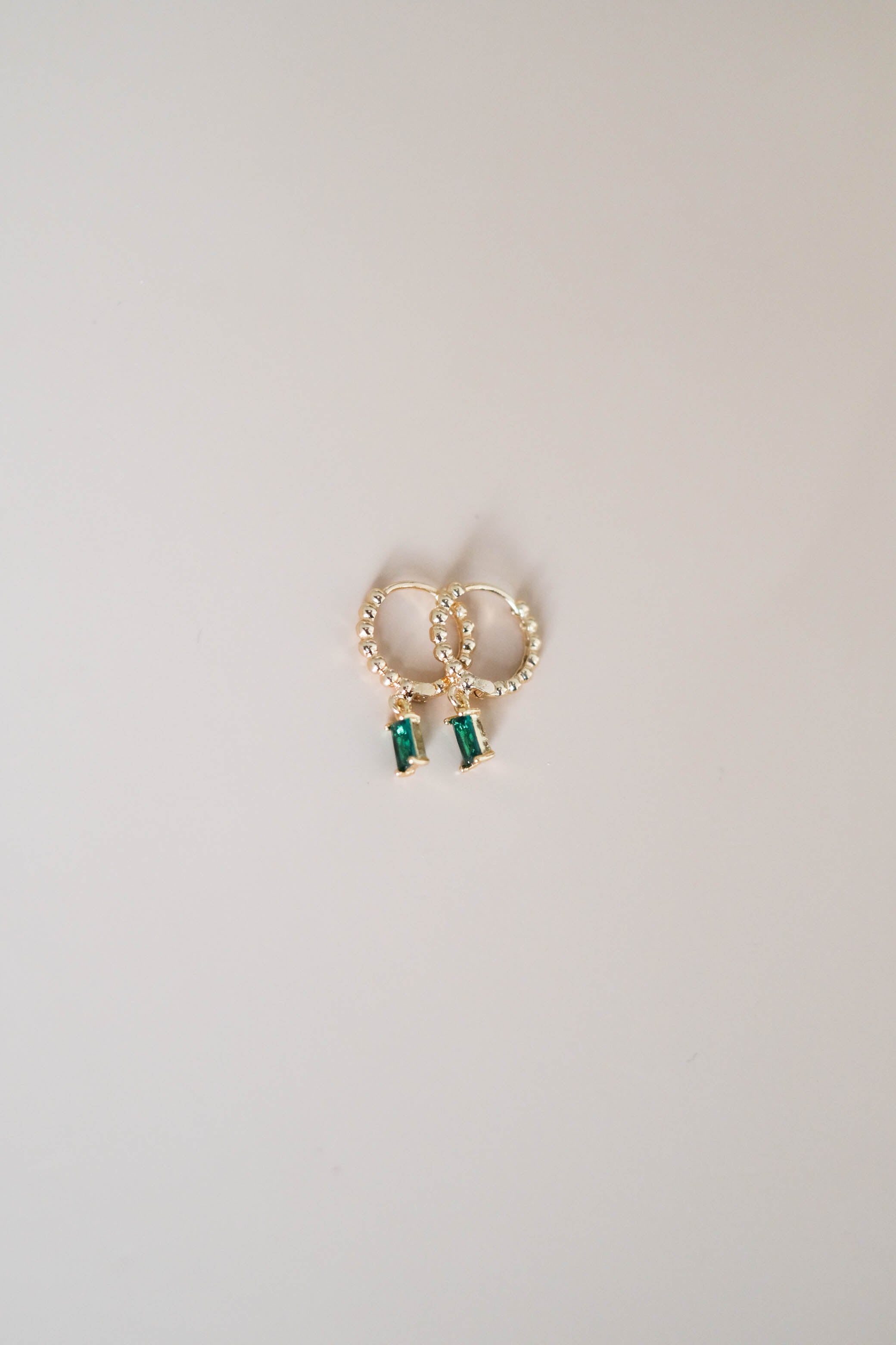 A dainty tiny square emerald green charm, tightly clamped in a gold setting, attached to our best selling Prosecco Beaded Hoops.