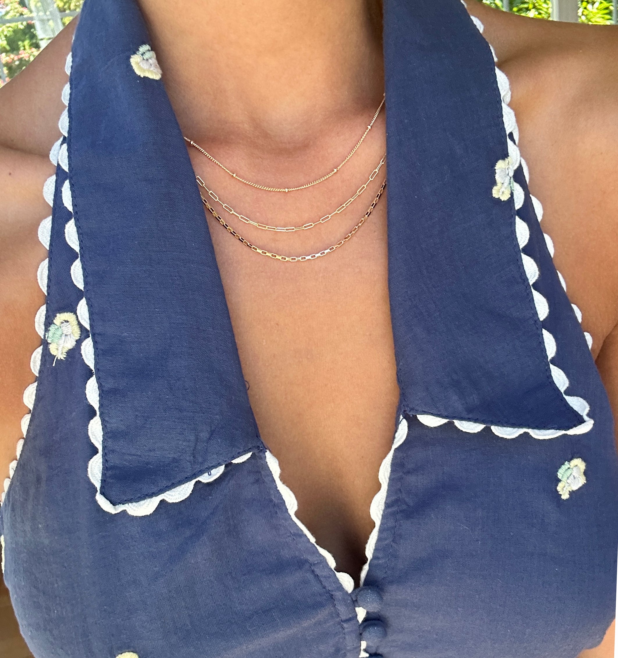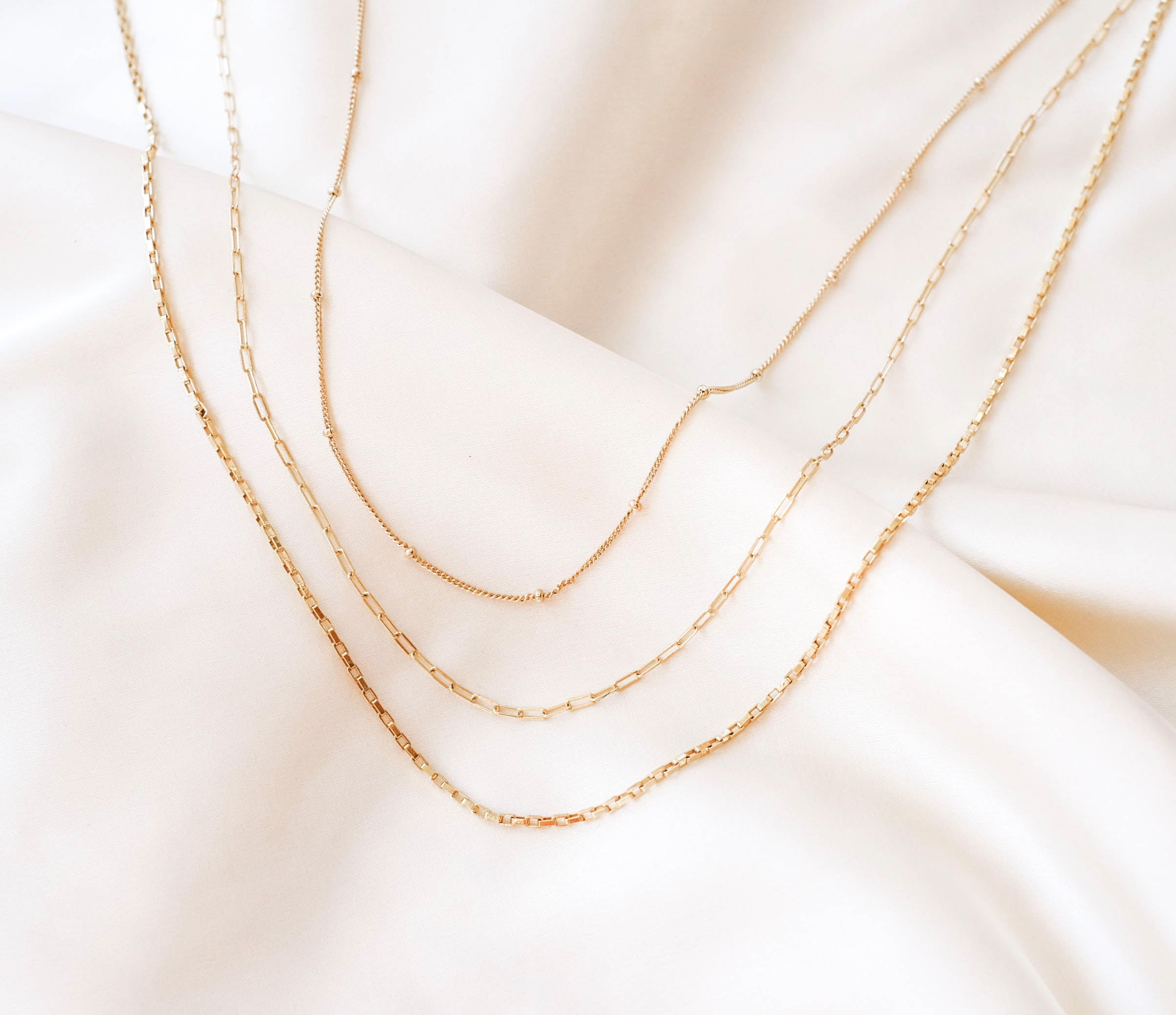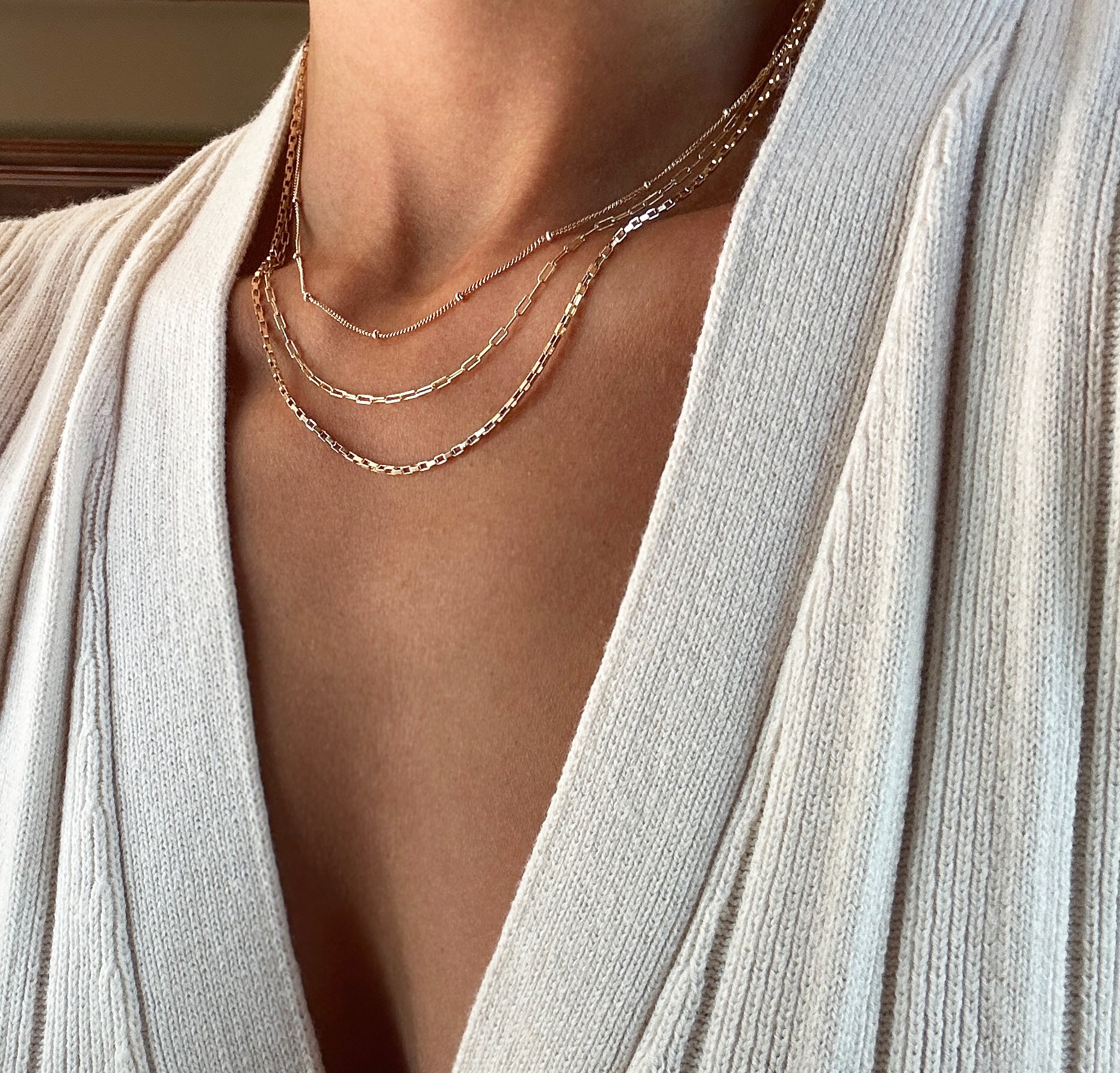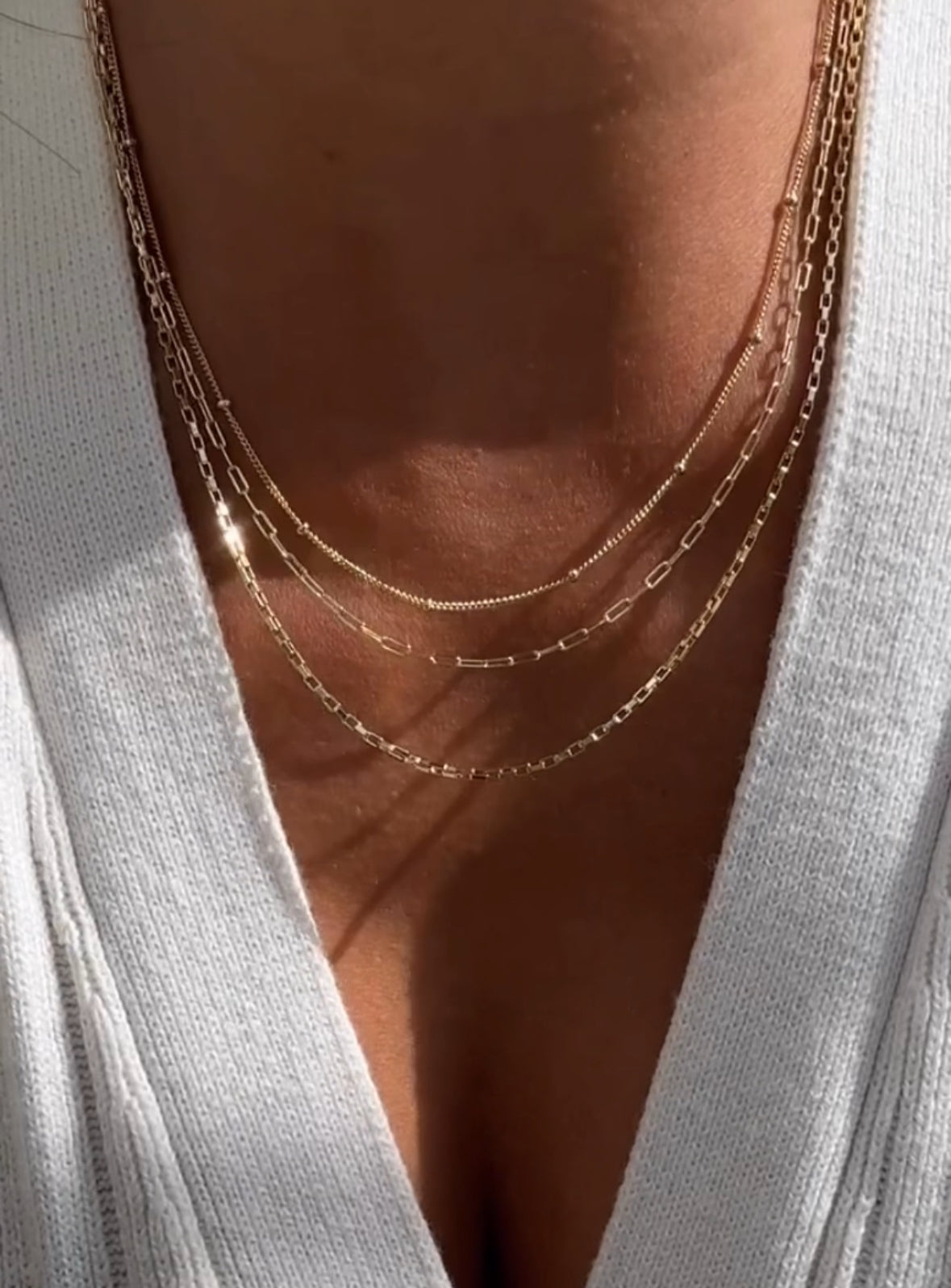 One of our favorite layered looks made up of some of LLUME's top selling necklaces: Linden Chain, Harlow Chain and Paperclip Chain