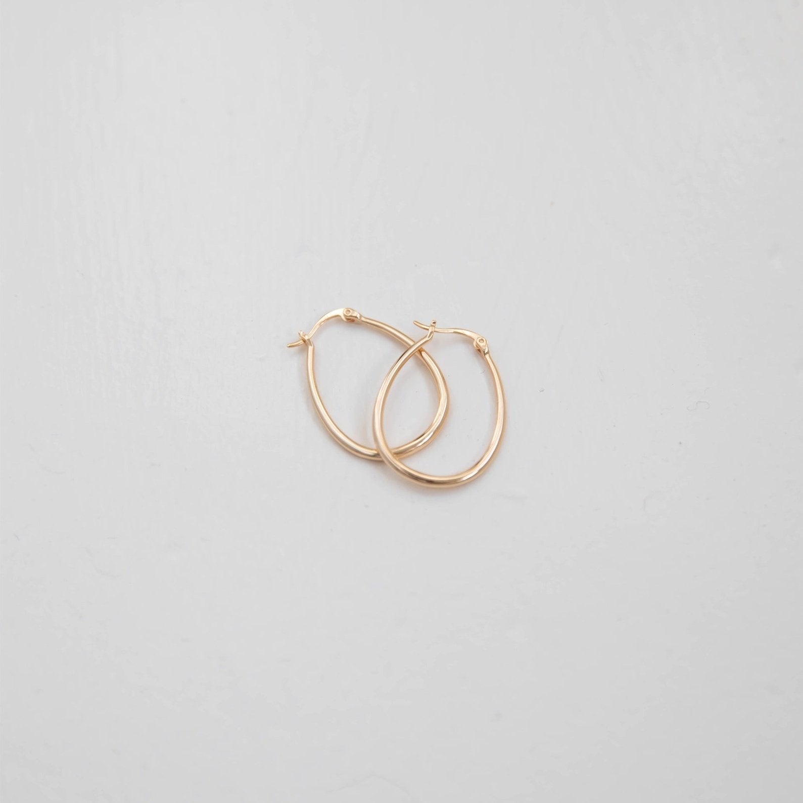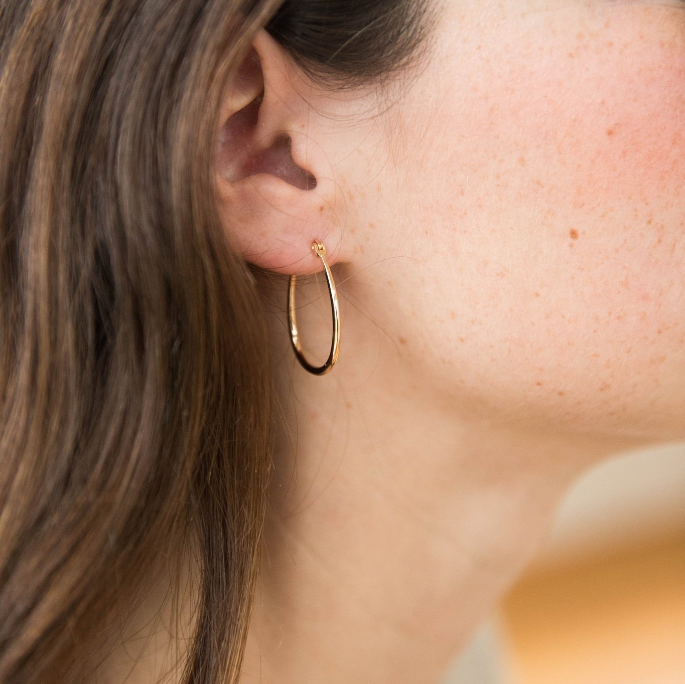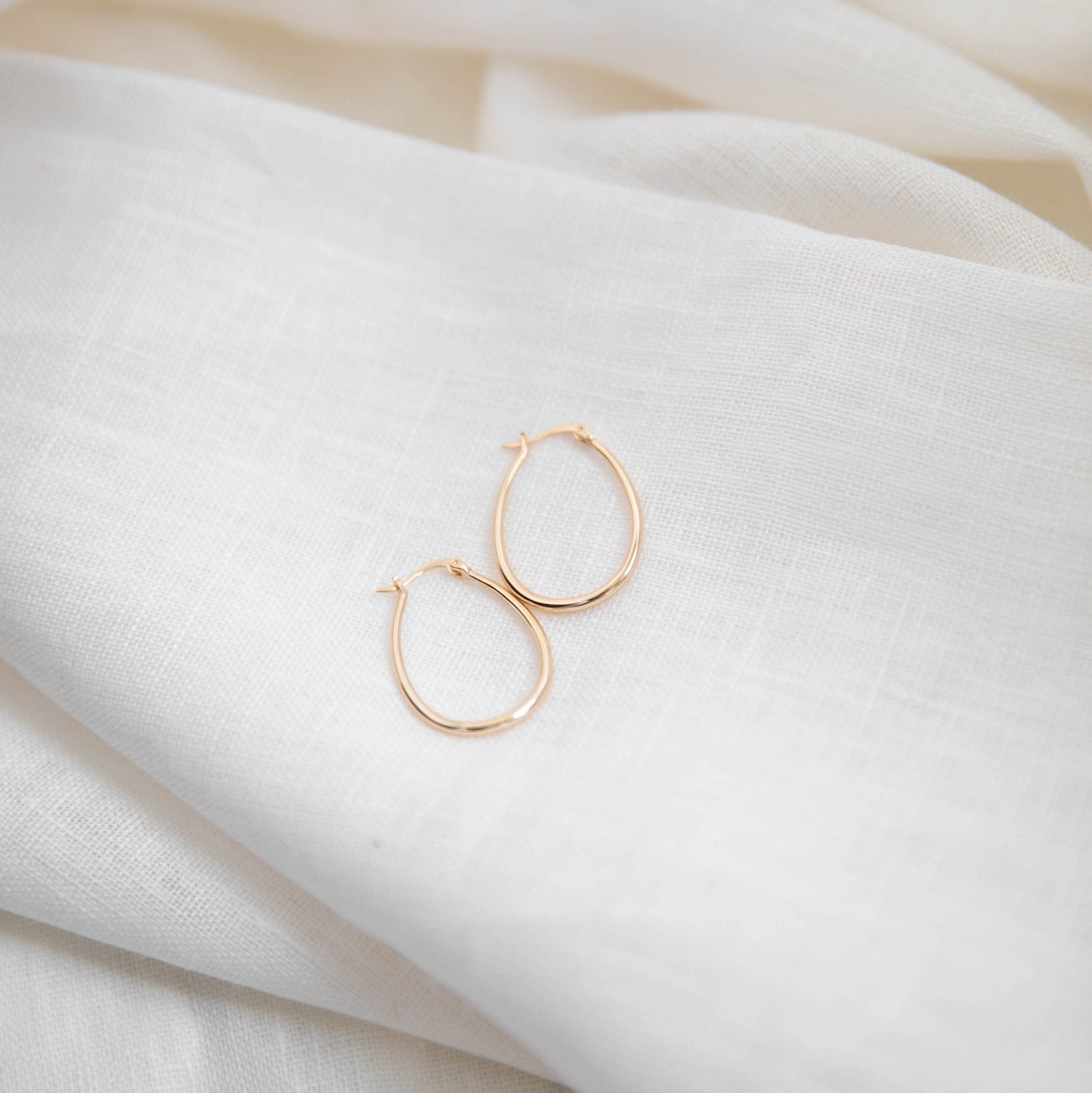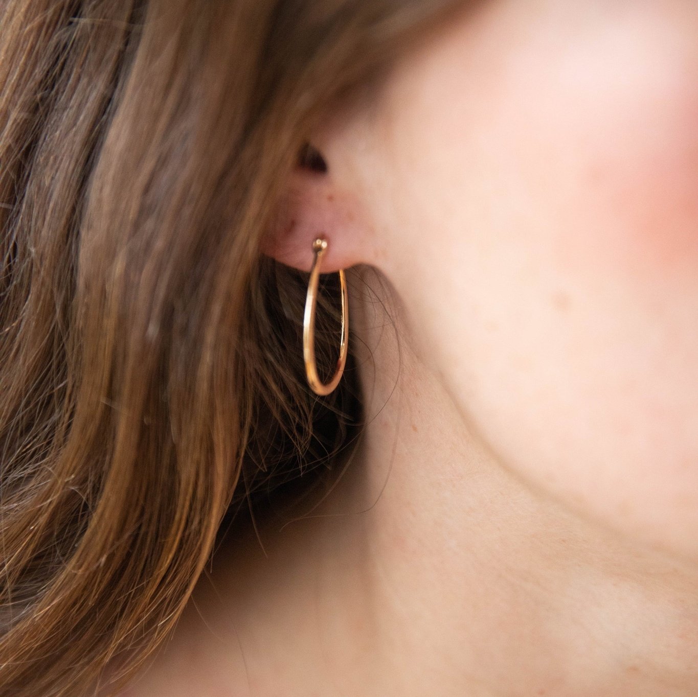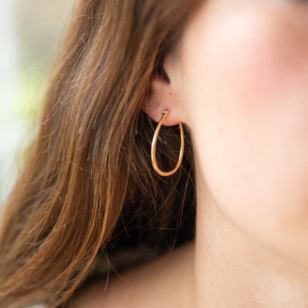 Classic for a reason. A every day hoop, in a perfect vintage toned gold. Perfectly imperfect organic oval shape with a secure lever back closure. Effortless yet transformative. A bigger hoop that stands out through all seasons with any outfit.