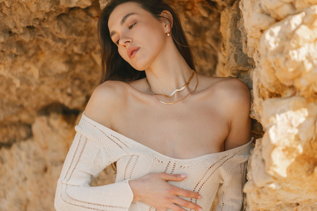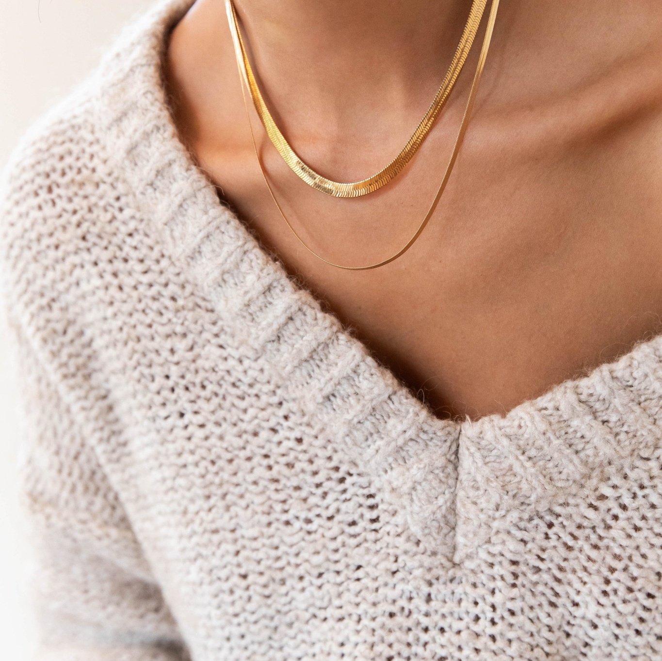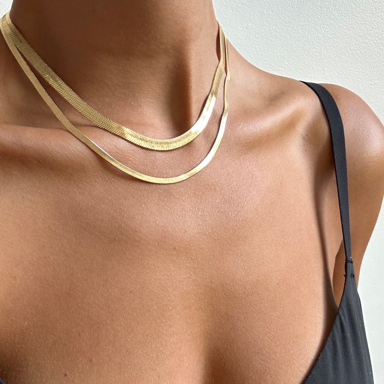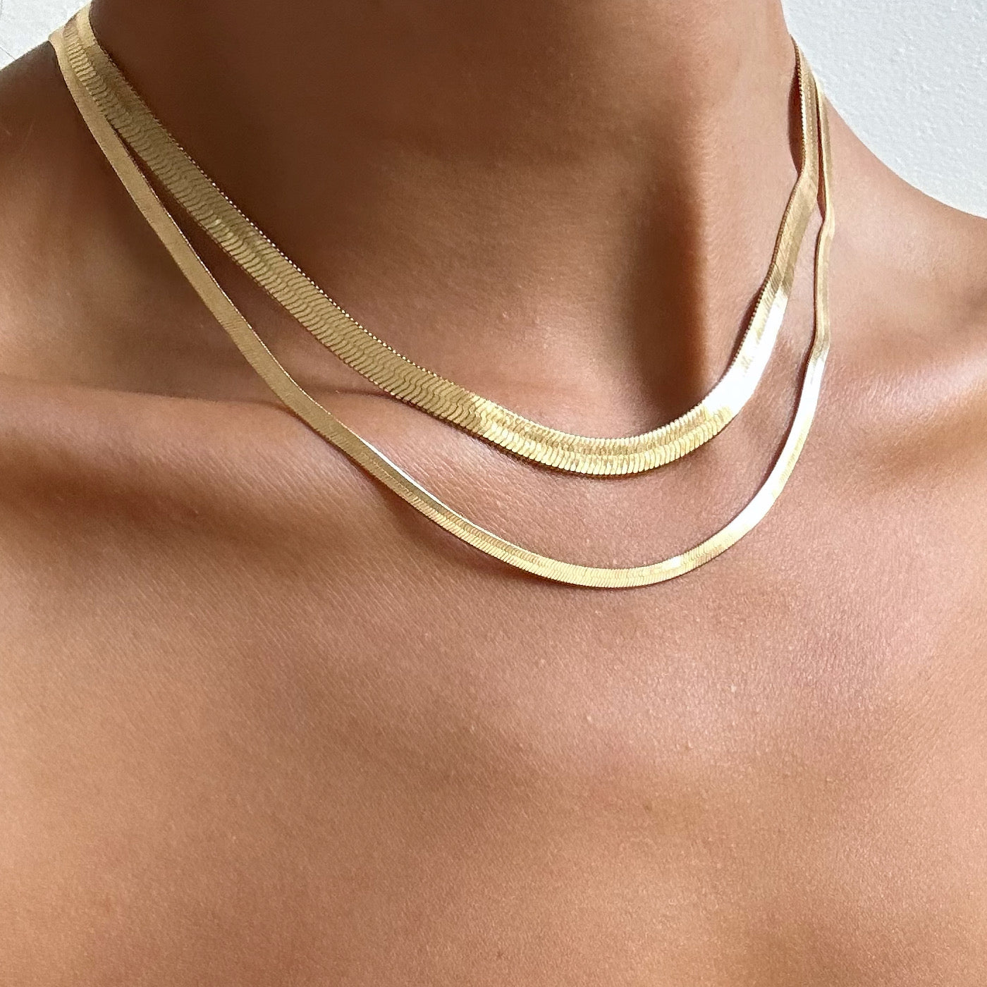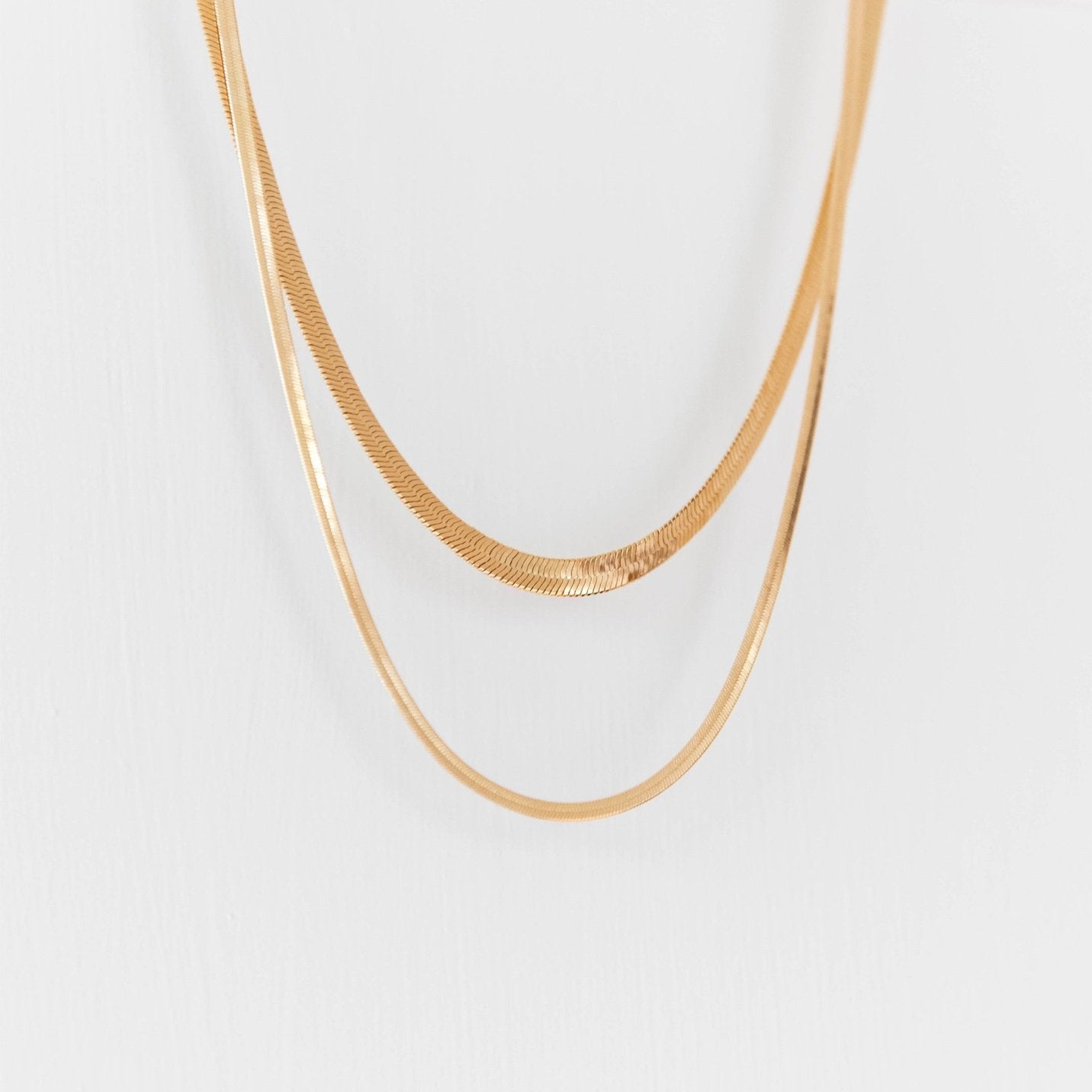Create a stunning visual impact with the Hailey Duo. This elegant accessory features two snake chains of varying thickness, adding a touch of sophistication to any classic outfit. Elevate your style with this luxurious duo.