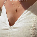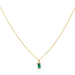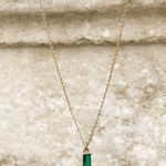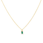 The necklace is a dainty tiny square emerald green charm, tightly clamped in a gold setting.