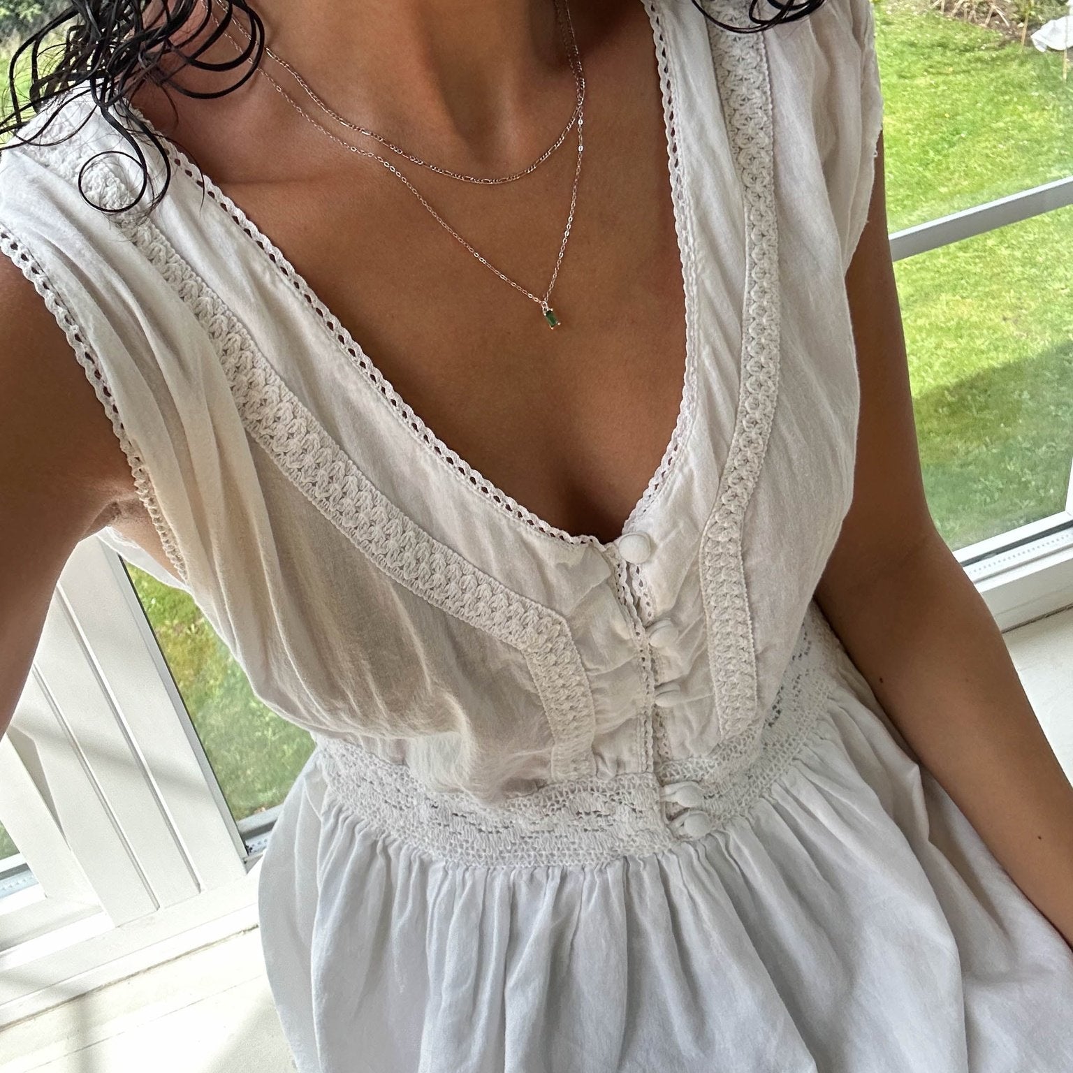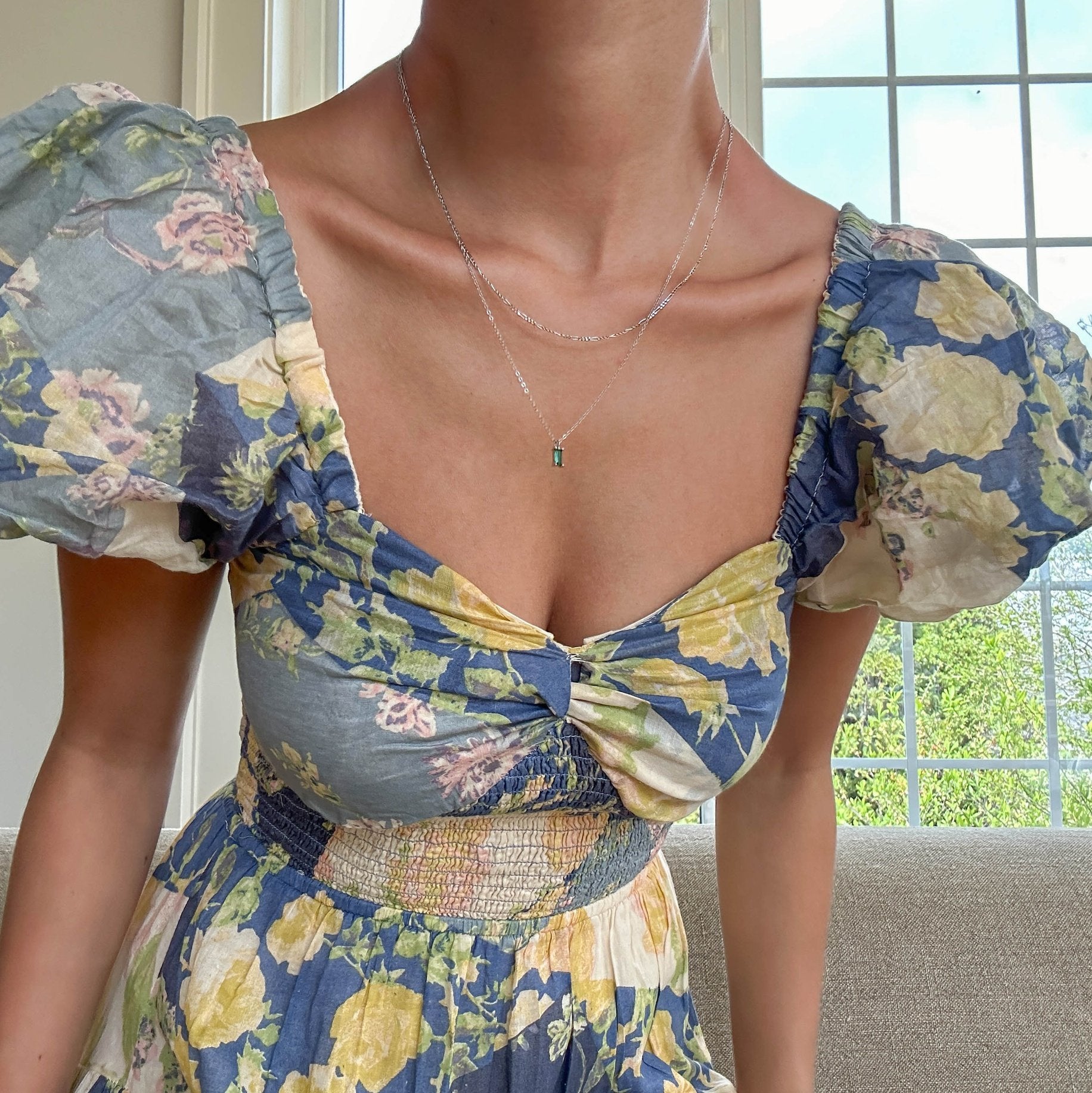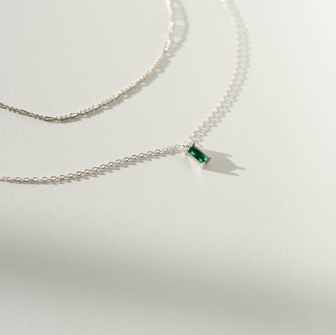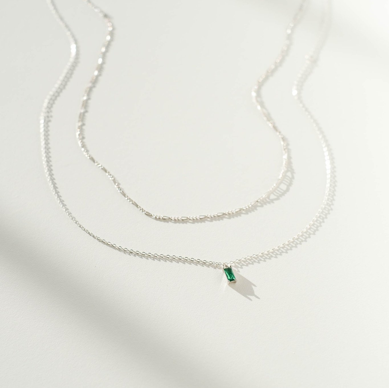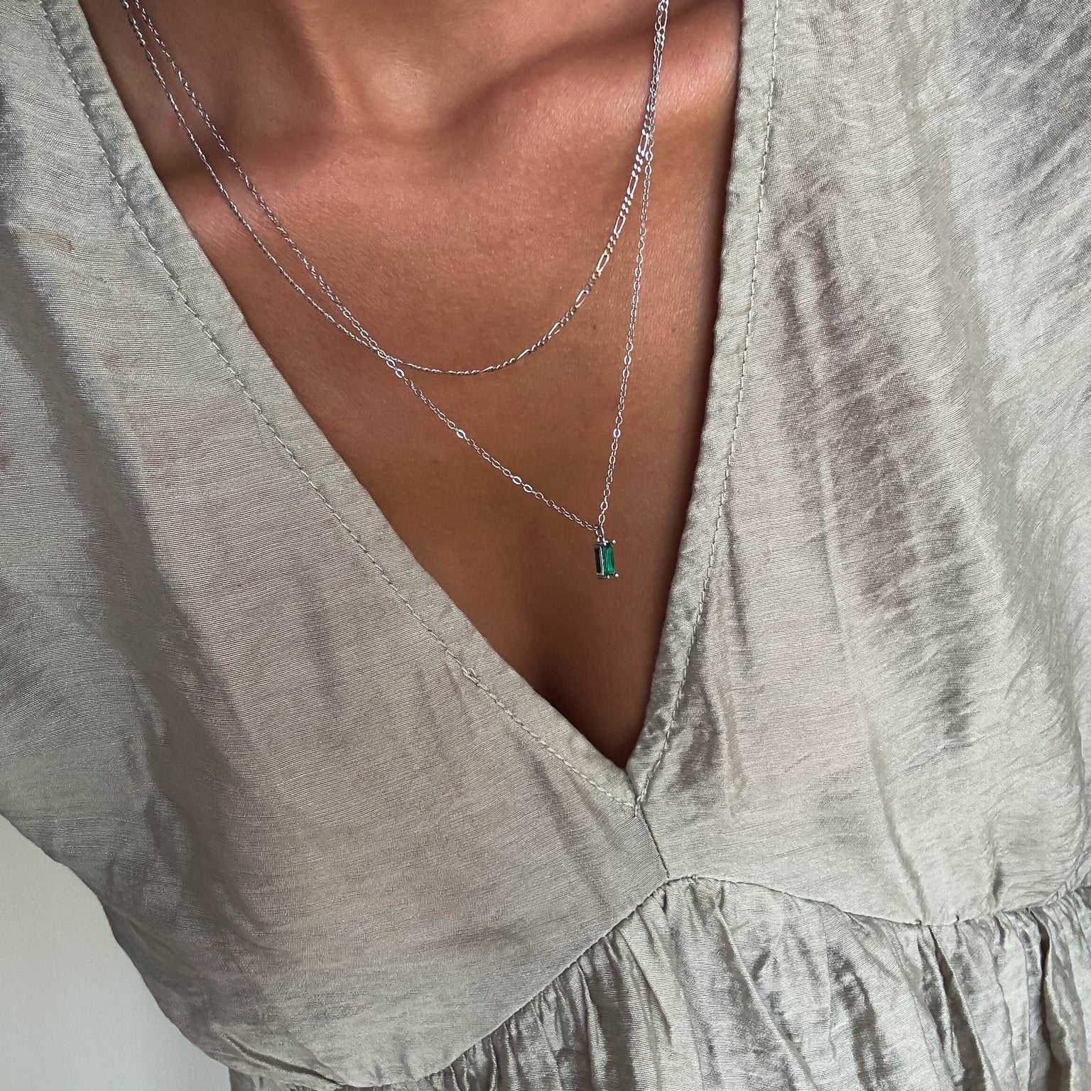 Now in silver: our Colette Necklace and our beloved emerald green Kismet pendant stacked for an effortless addition to your everyday outfits.