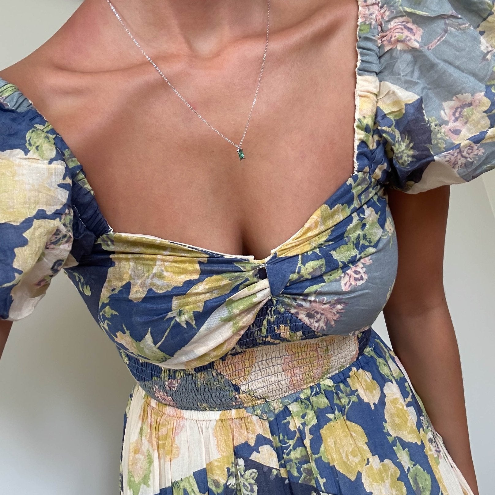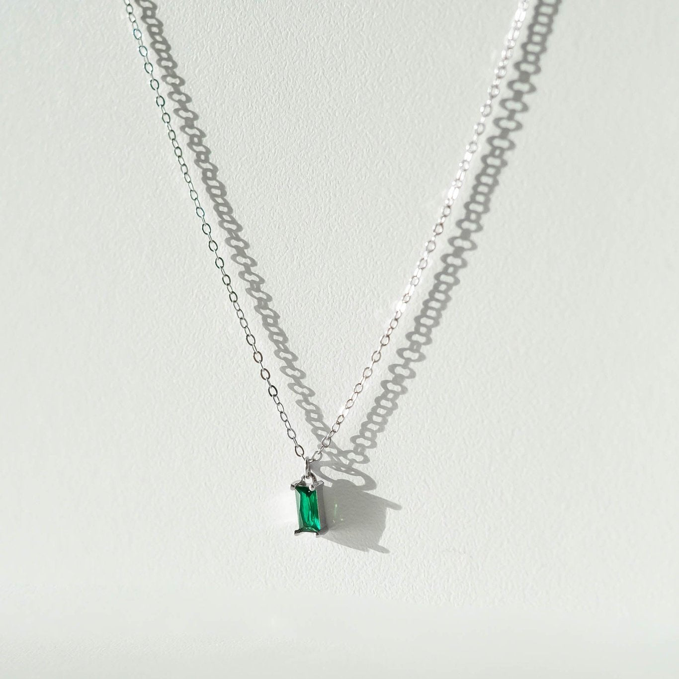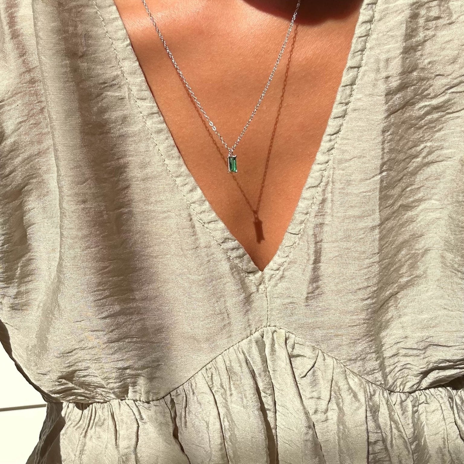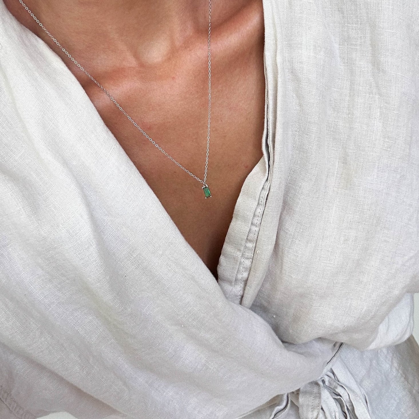 The necklace is a dainty tiny square emerald green charm, tightly clamped in a 925 silver setting.