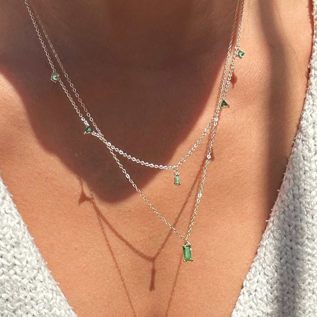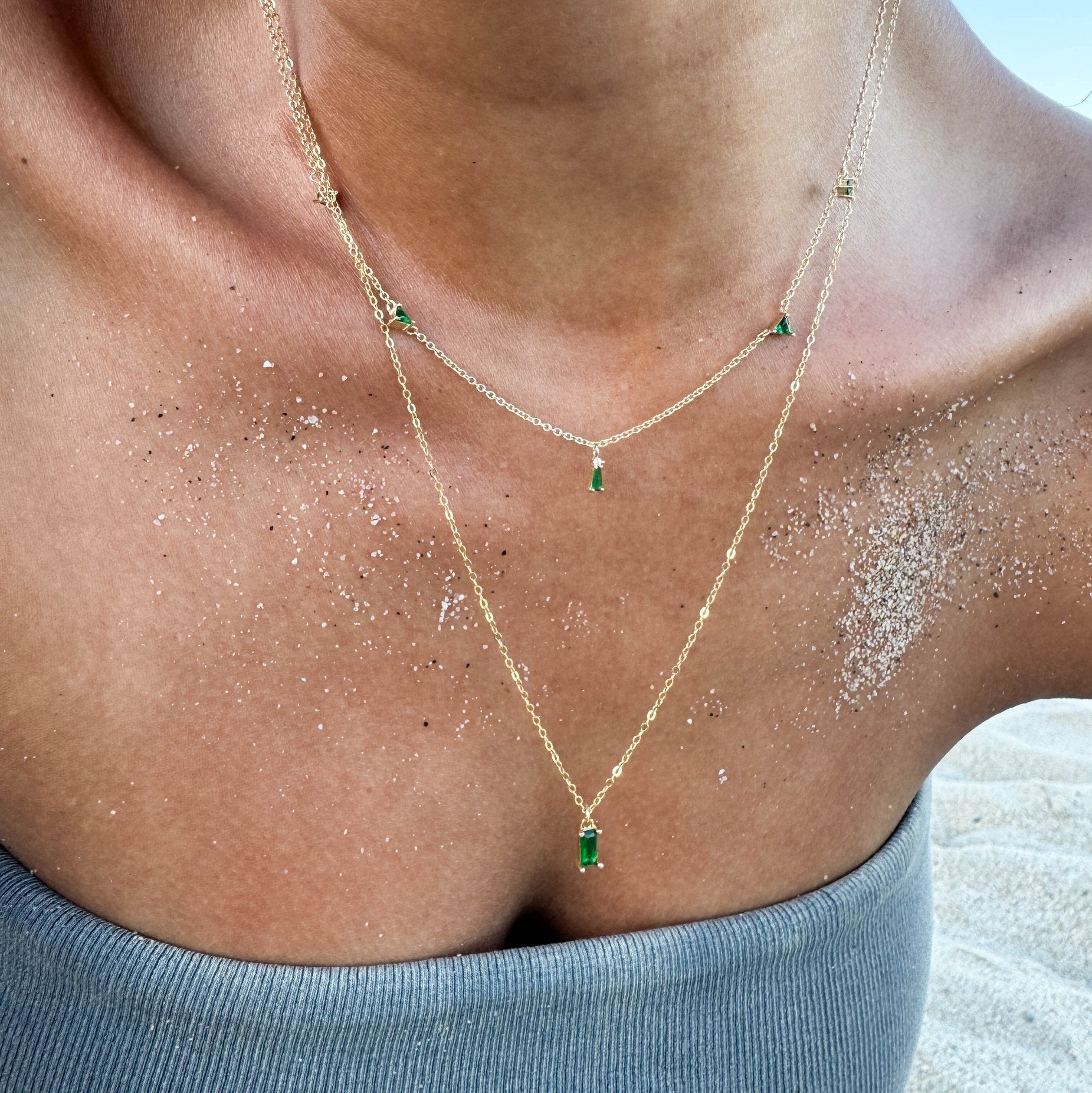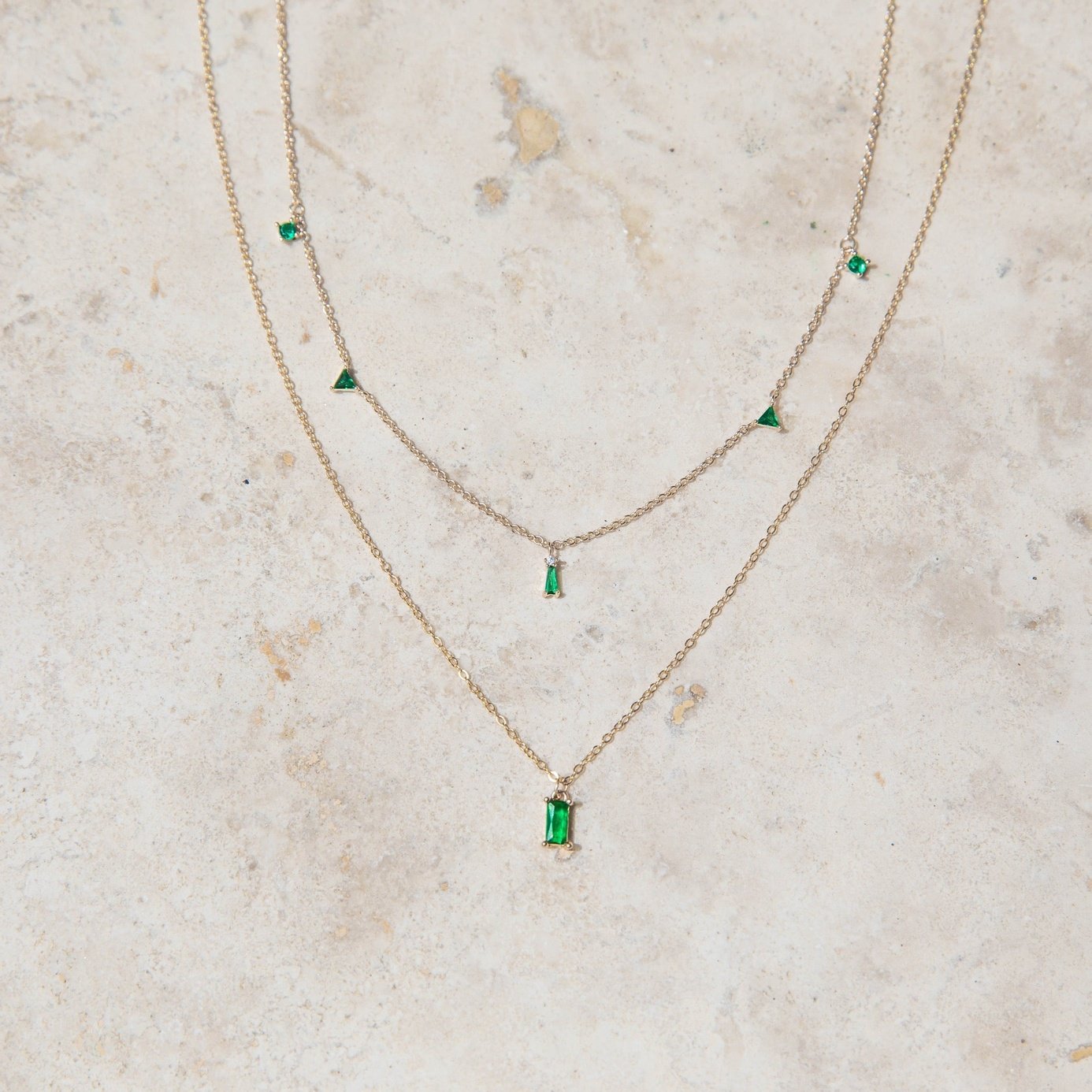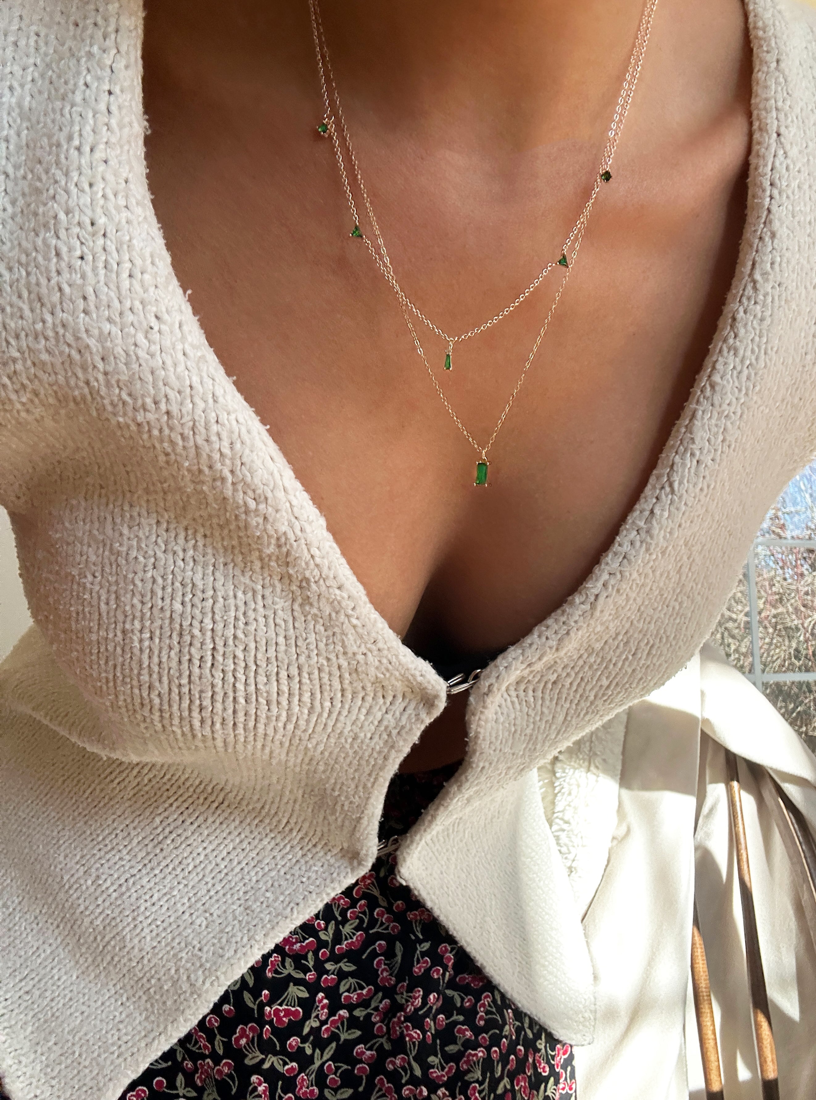 Our stunning Ivy necklace and our beloved emerald green Kismet pendant stacked for an effortless addition to your everyday outfits.