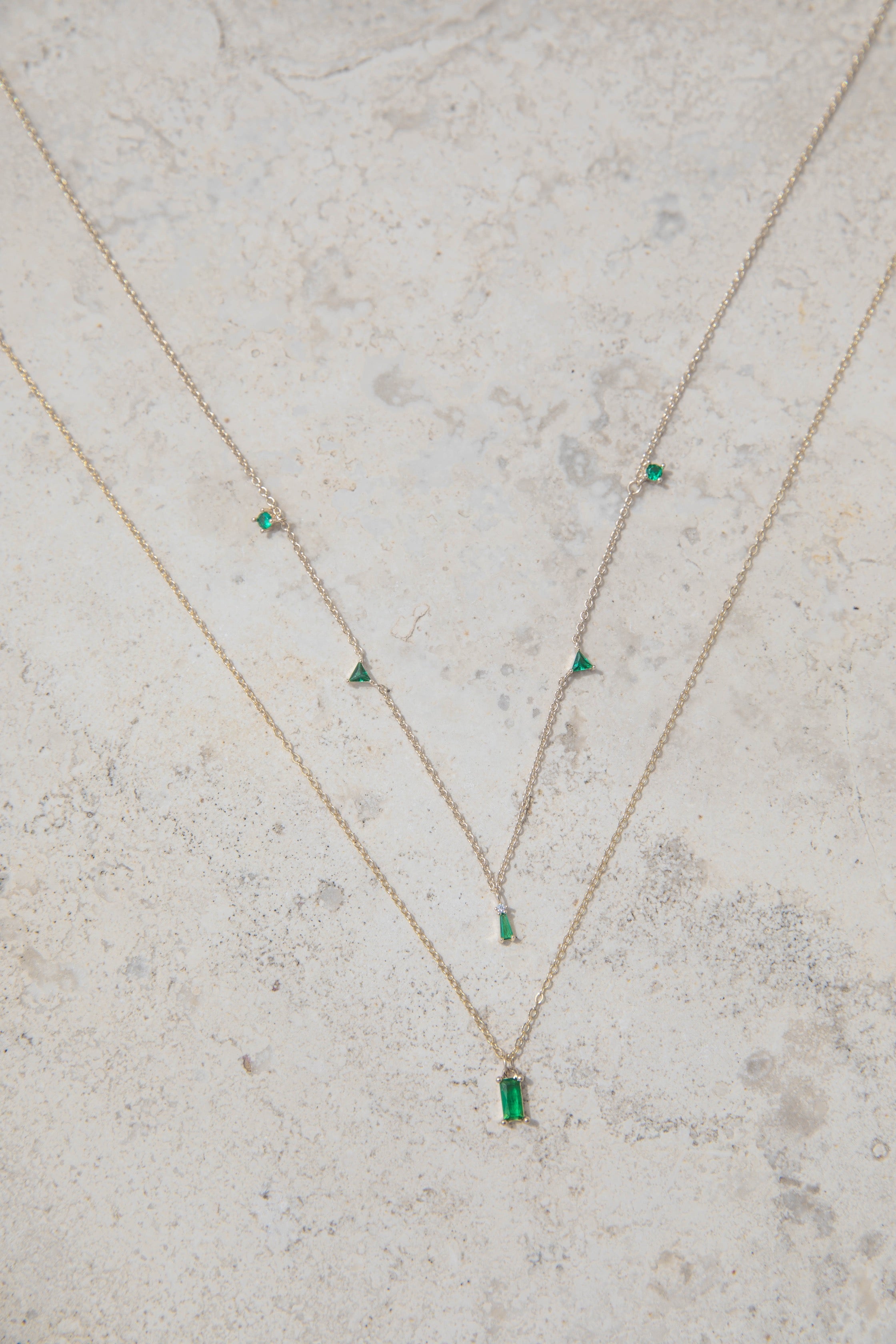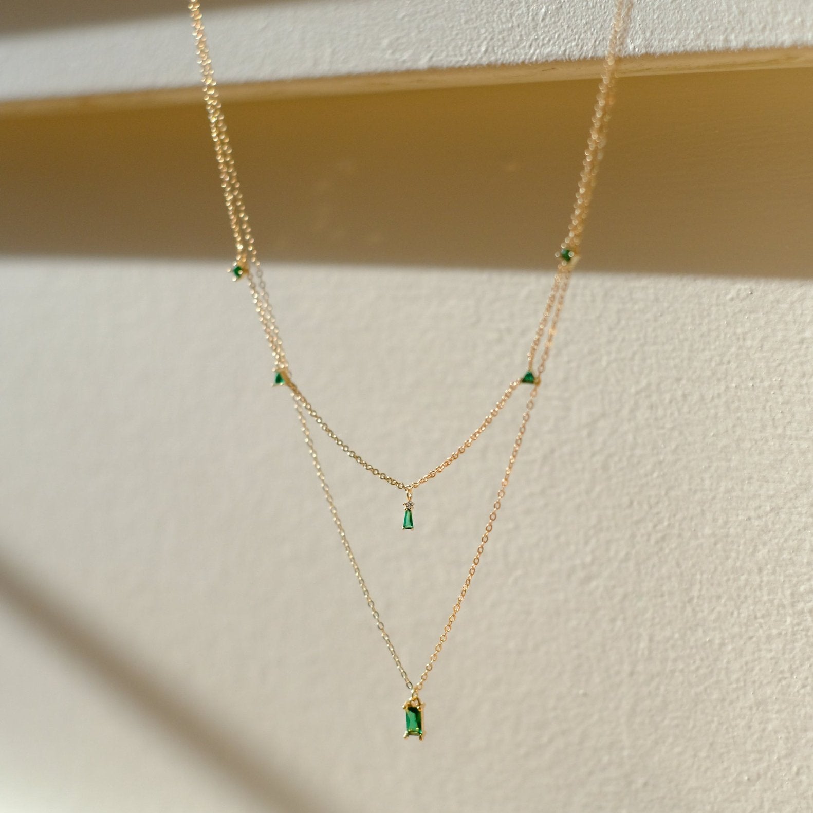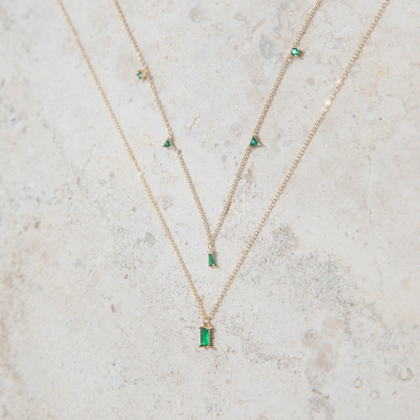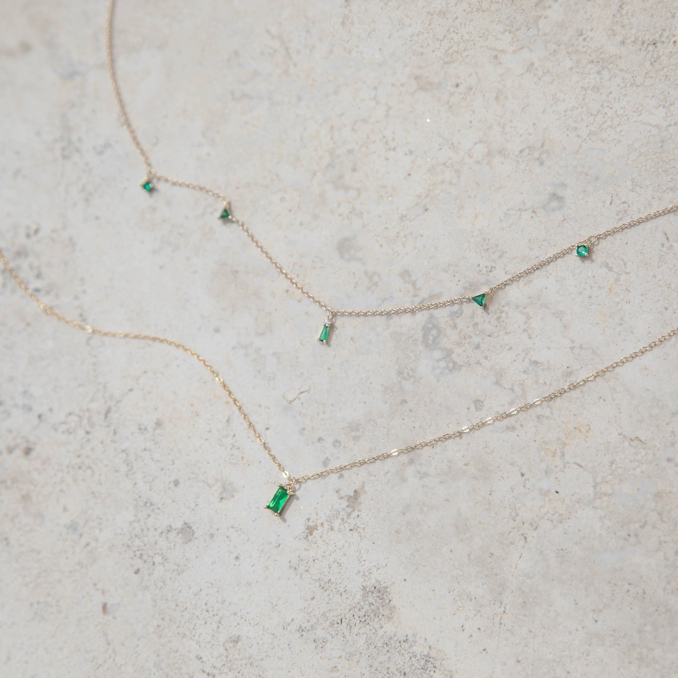 Our stunning Ivy necklace and our beloved emerald green Kismet pendant stacked for an effortless addition to your everyday outfits.