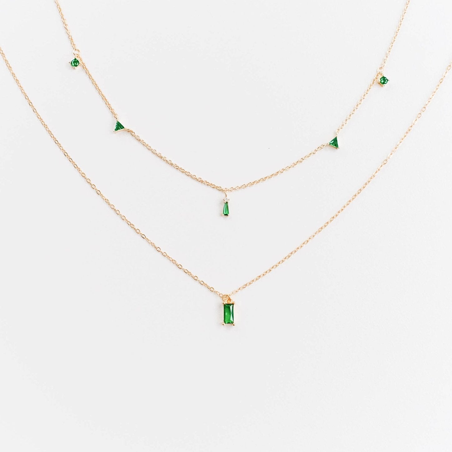 Elevate your style with our Kismet Cluster necklace. Featuring two emerald green necklaces, this layered look exudes luxury and sophistication. Add a touch of elegance to any outfit and make a statement with this stunning piece.