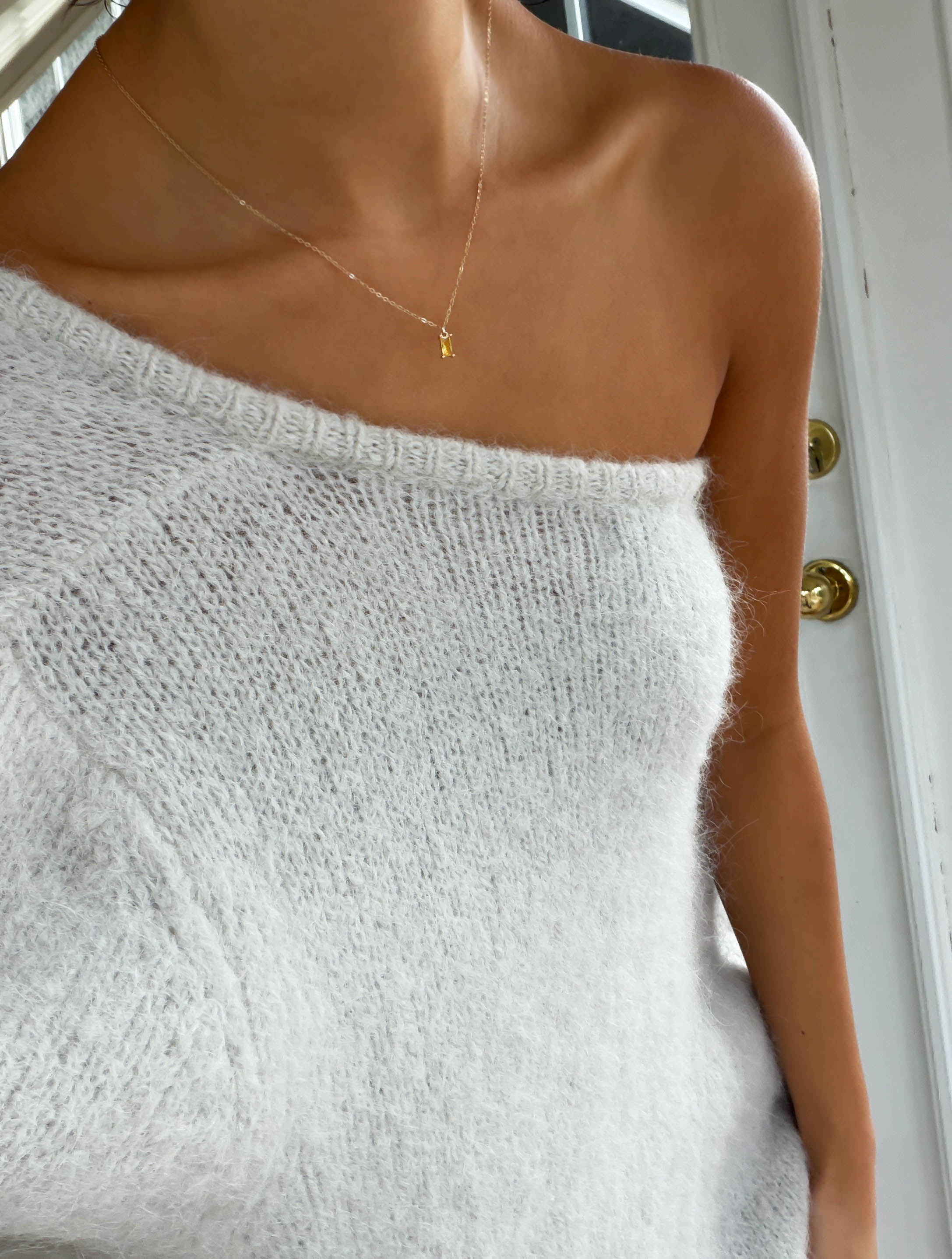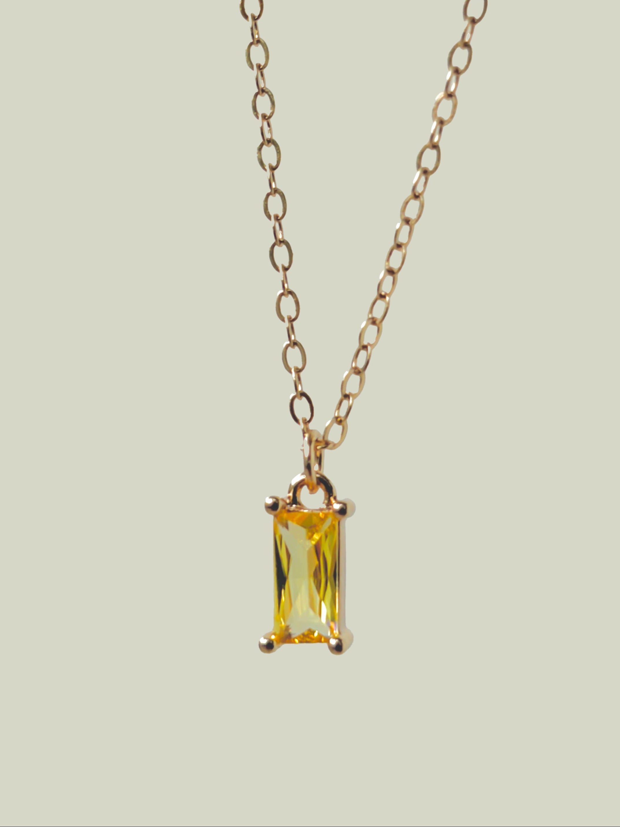 The necklace is a dainty tiny rectangle yellow charm, tightly clamped in a gold setting.