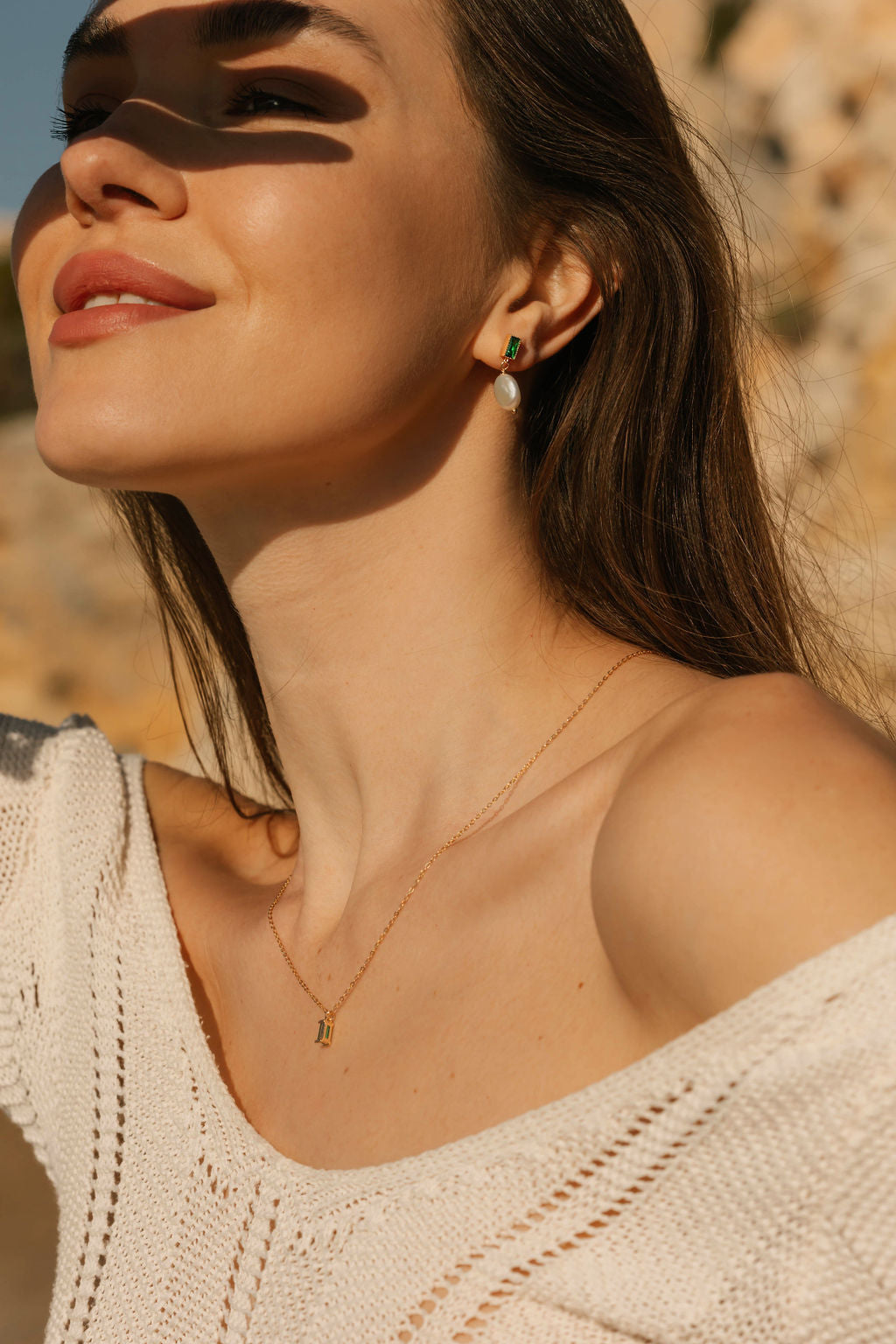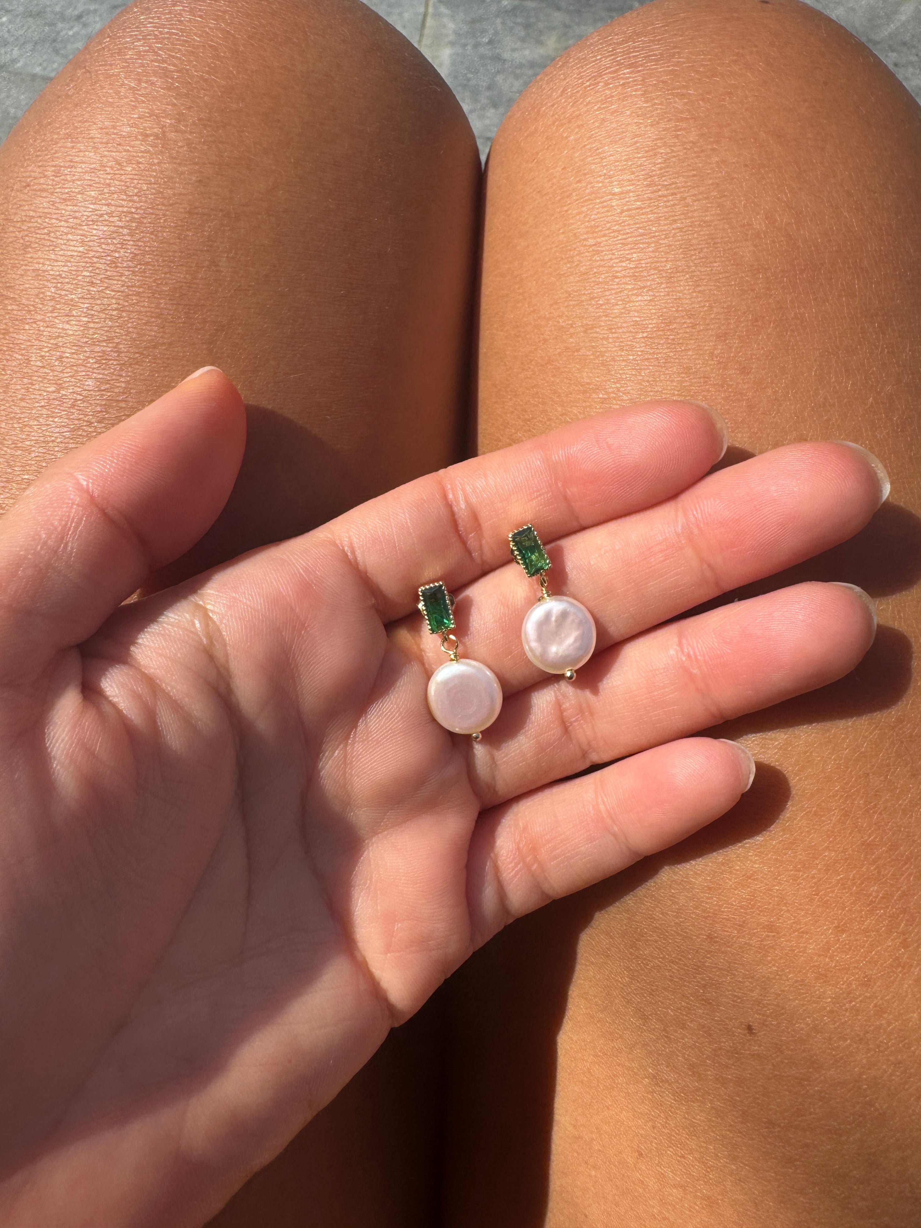 Truly unforgettable earrings, they are an Ode to our best selling kismet collection. The gorgeous kismet green baguette gem perfectly paired with freshwater pearls.