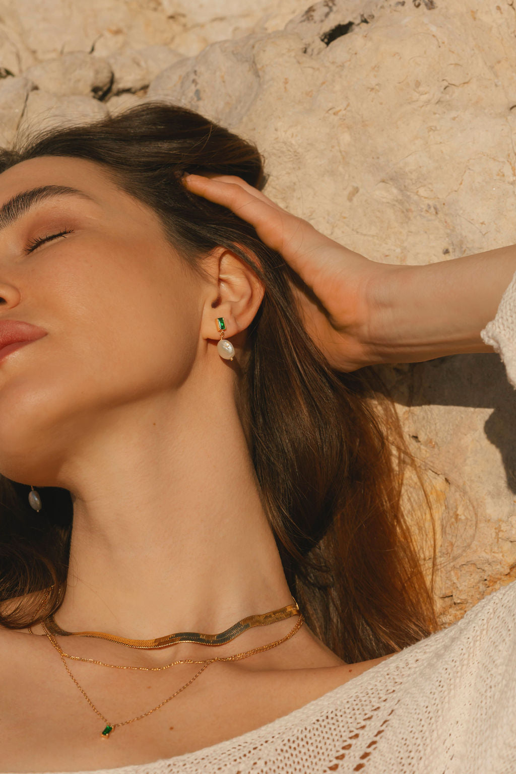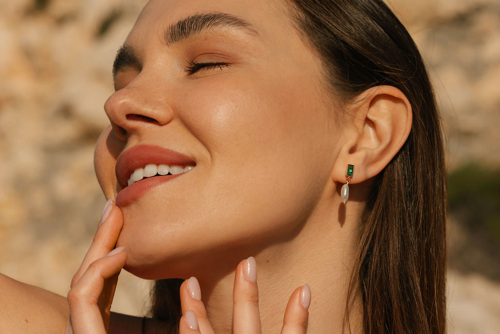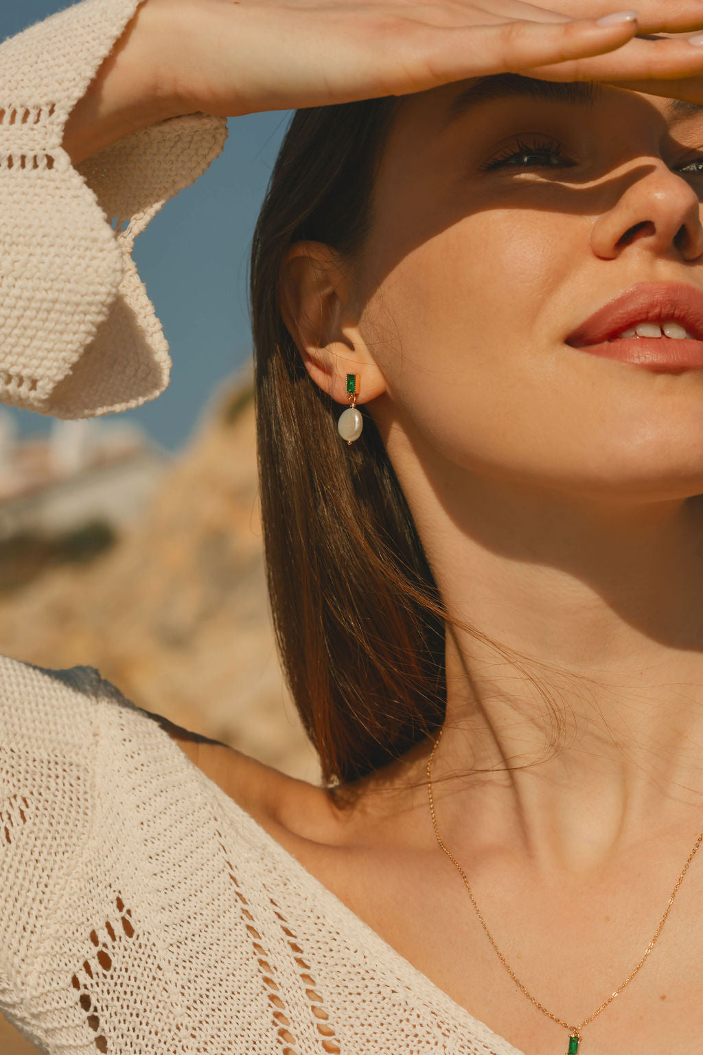The Moonlit Pearl Drop earrings with a captivating pearl and emerald green gem. Embrace sophistication and grace with these show-stopping drops. These pretty pearl earrings will add a touch of sophistication to any outfit. Handcrafted with delicate details, they are a timeless accessory that will elevate your look. Perfect for any special occasion or simply to bring a statement into every day outfits.