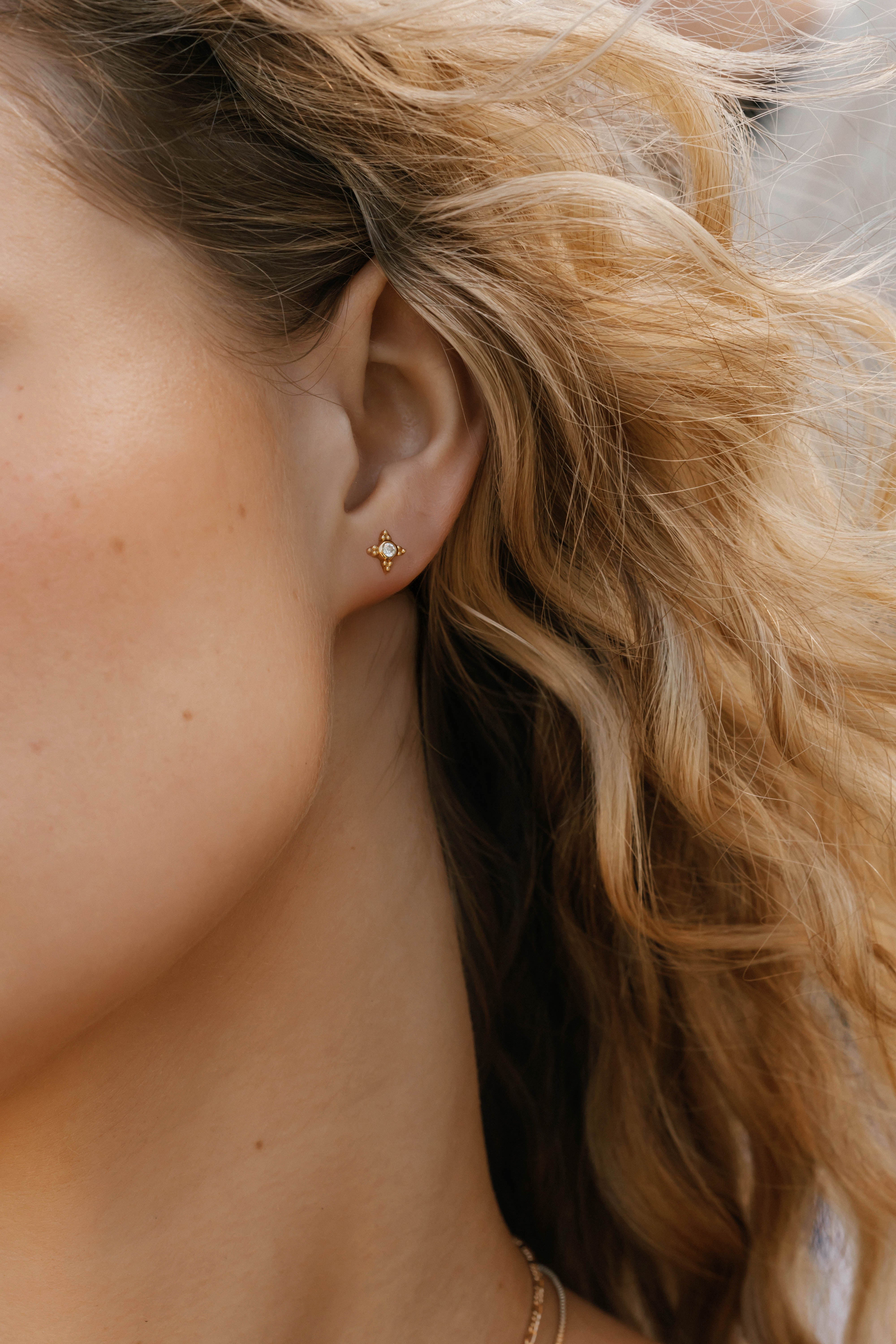 A close-up shows a woman's ear wearing LLUME Jewelry's Myra Studs—delicate earrings with a tiny central gemstone. Her wavy blonde hair frames her naturally toned skin, while a softly blurred background accentuates the jewelry.
