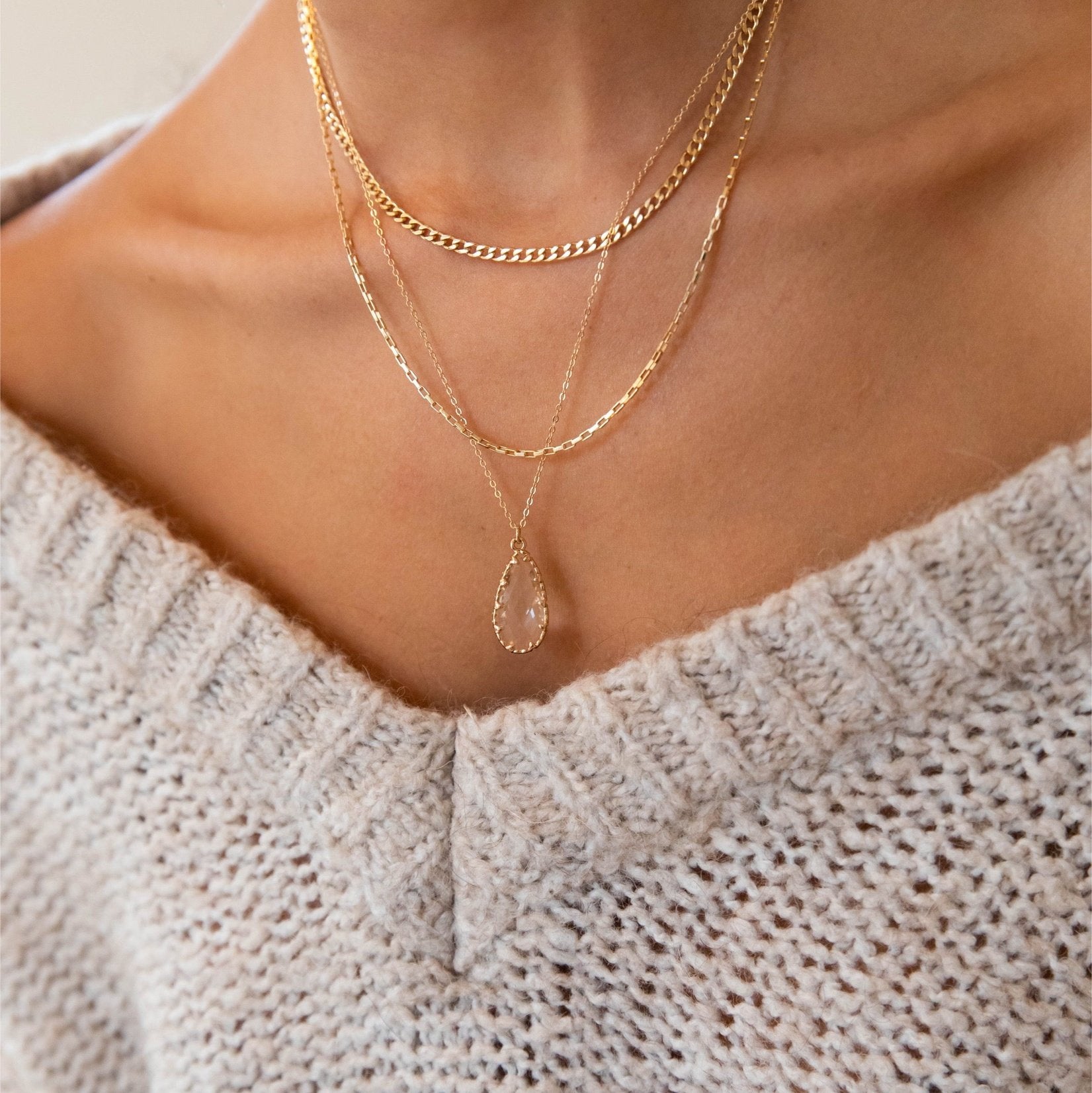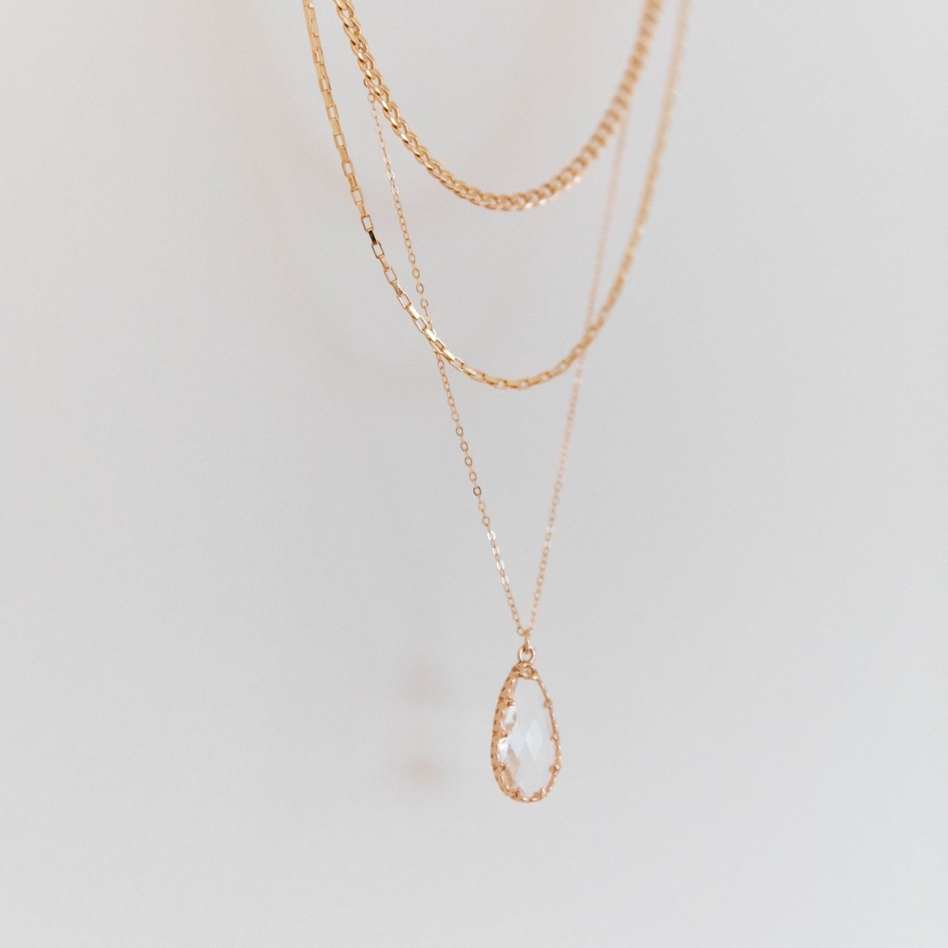 Three different chain textures and the gorgeous glass pendant for an effortless addition to your everyday outfits.