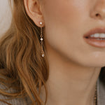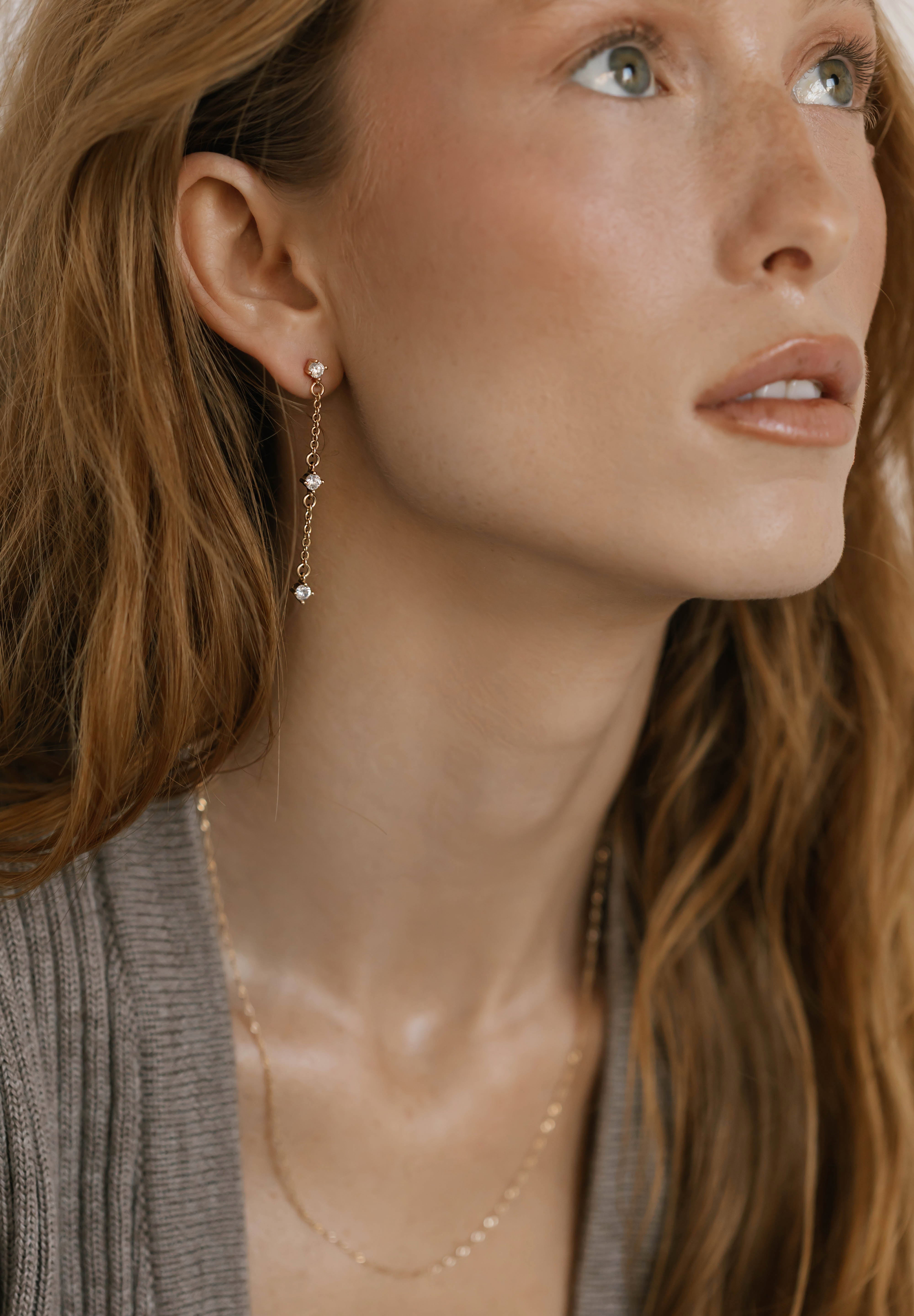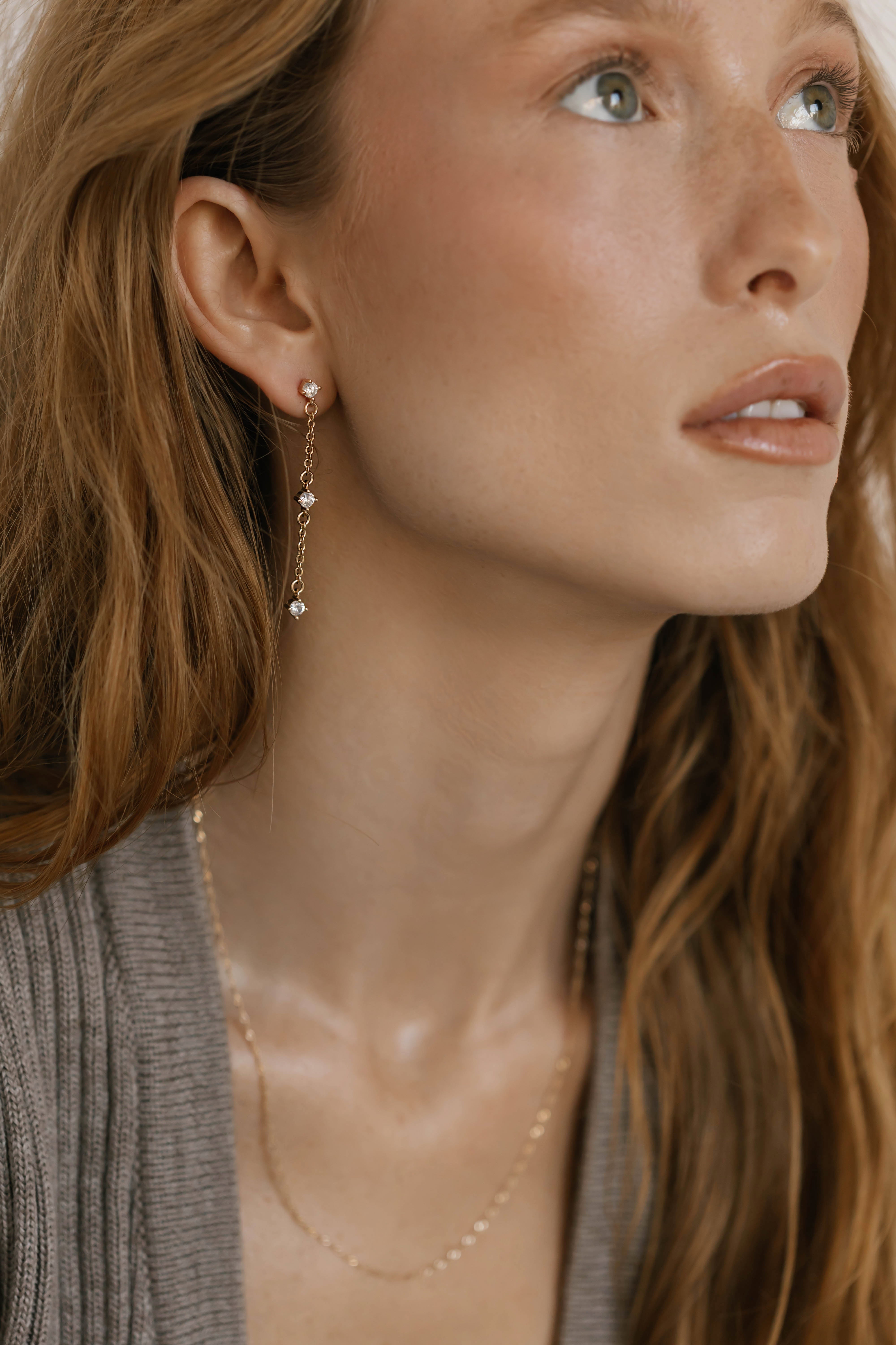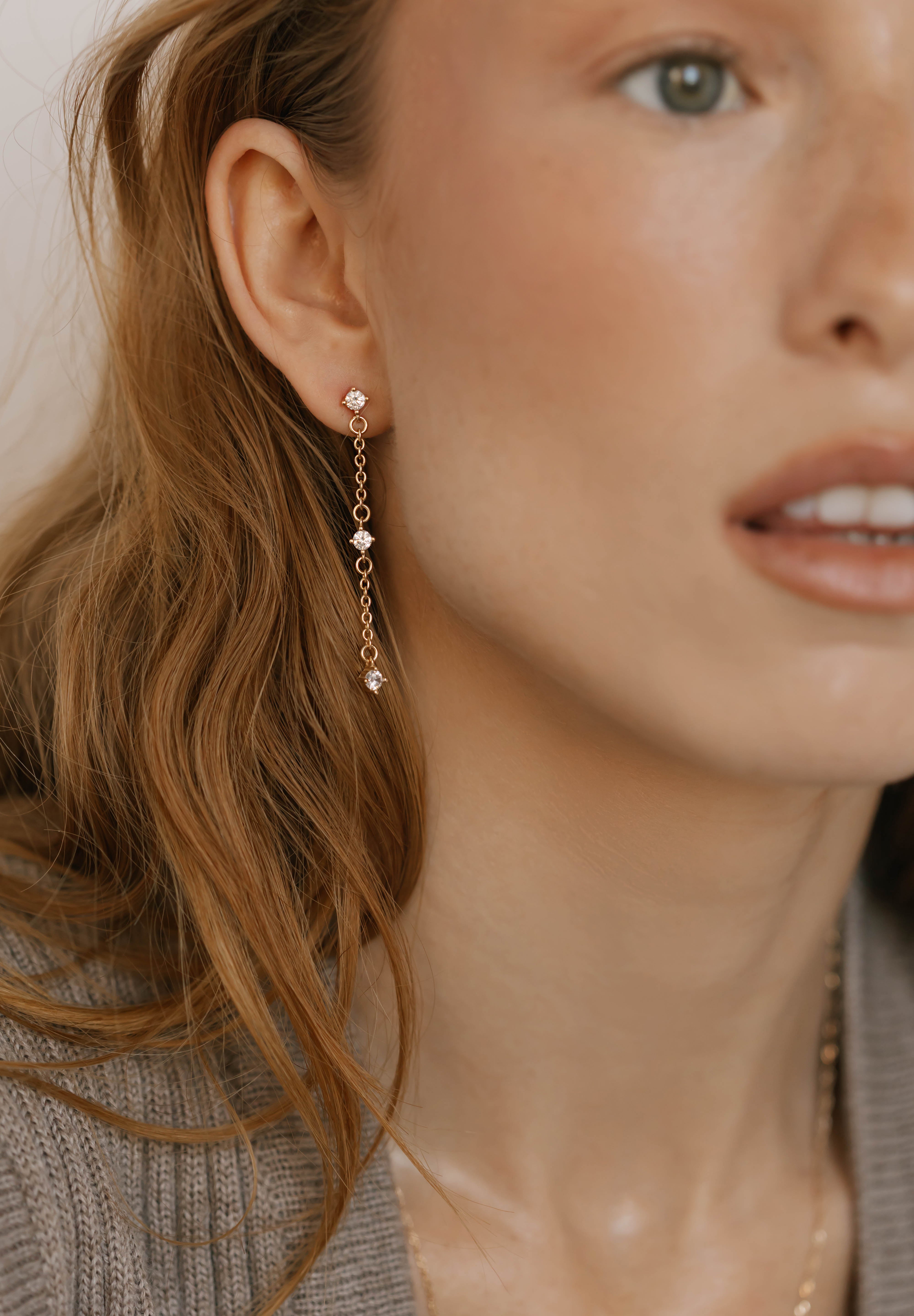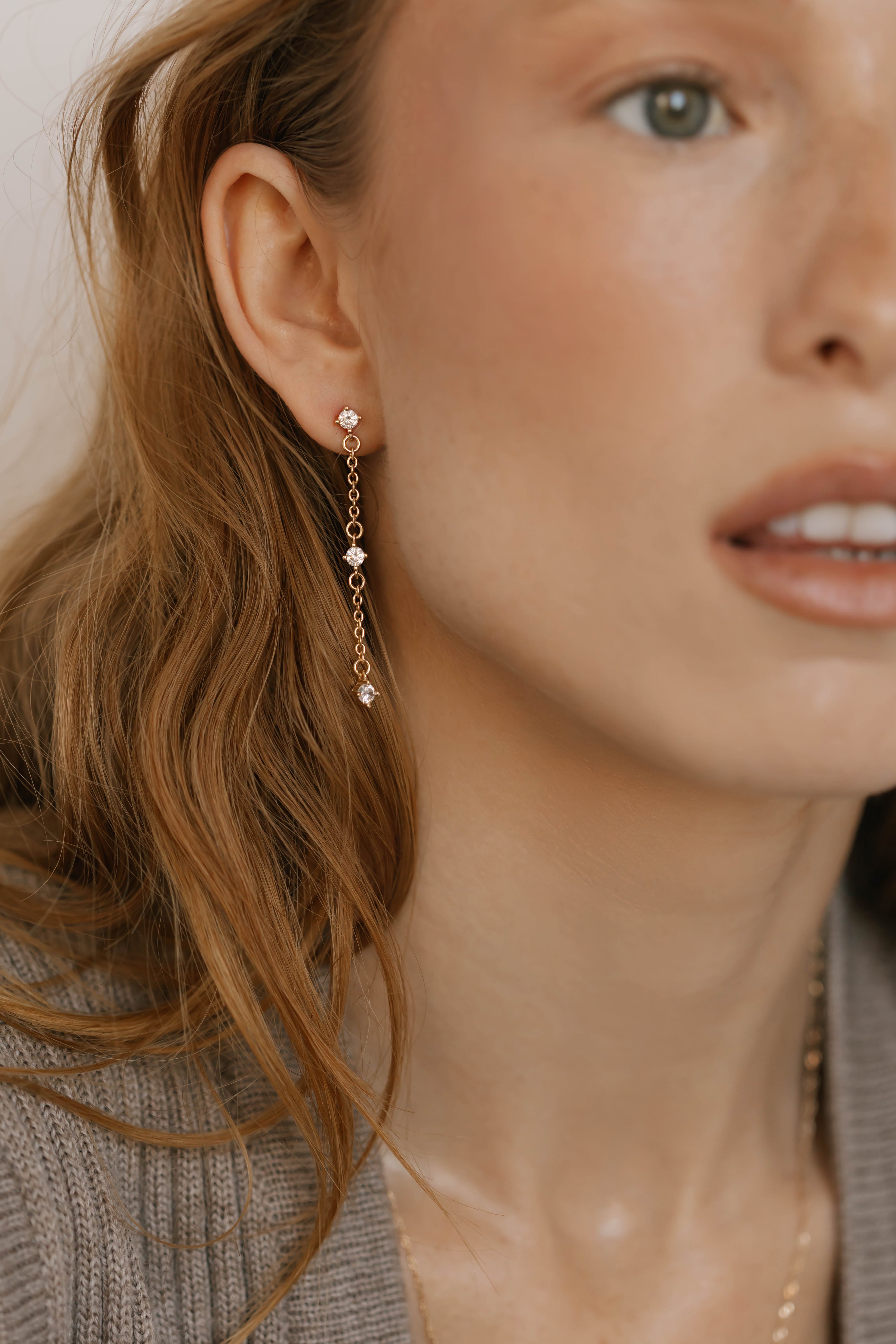 The Reverie Earrings feature a delicate arrangement of three shimmering drops that come together to create a truly striking design. These earrings effortlessly add an elegant and graceful touch to any outfit, making them perfect for both everyday wear and special occasions. Their radiant sparkle enhances your natural beauty while providing a subtle yet captivating statement. Embrace the charm and confidence that these beautiful earrings bring to your look.