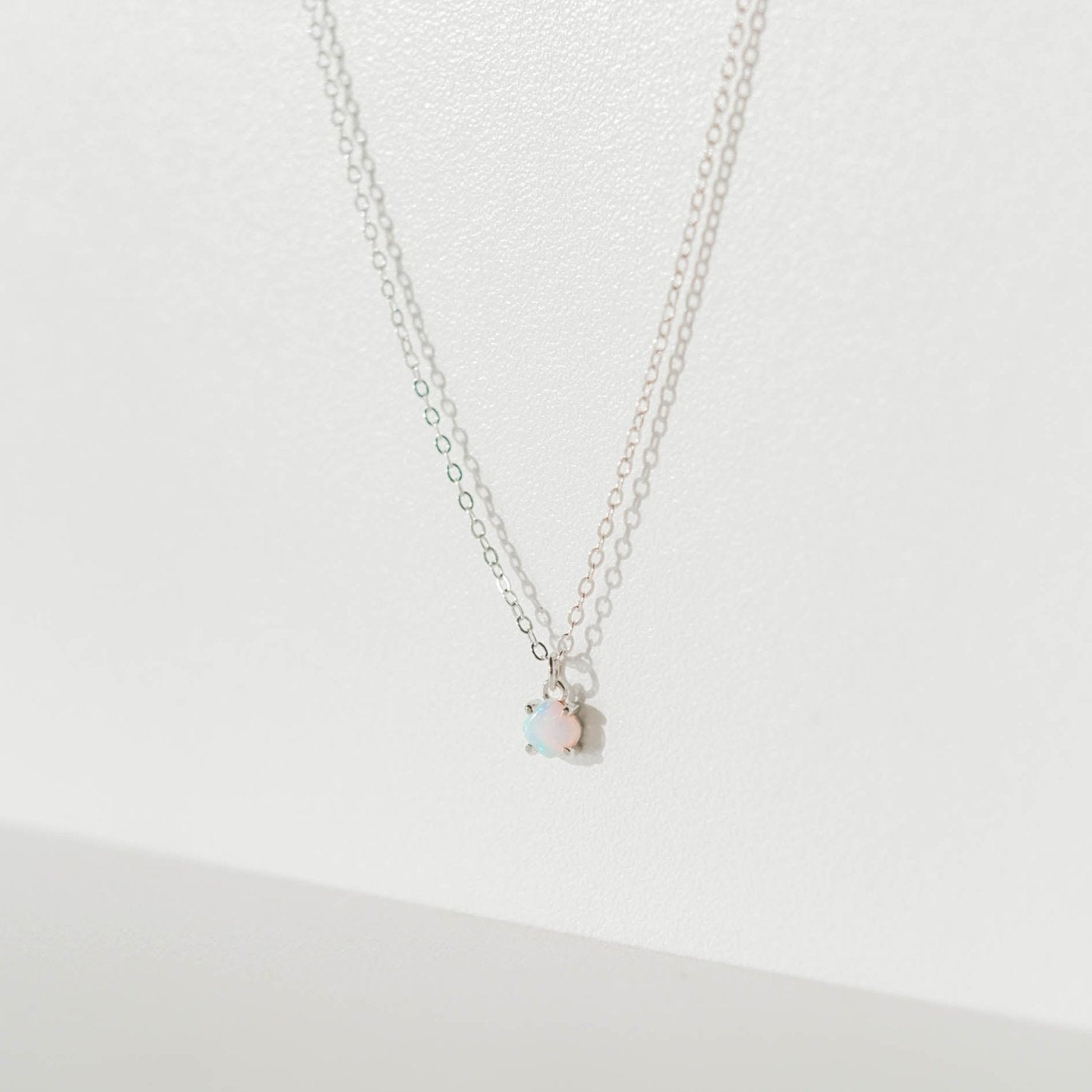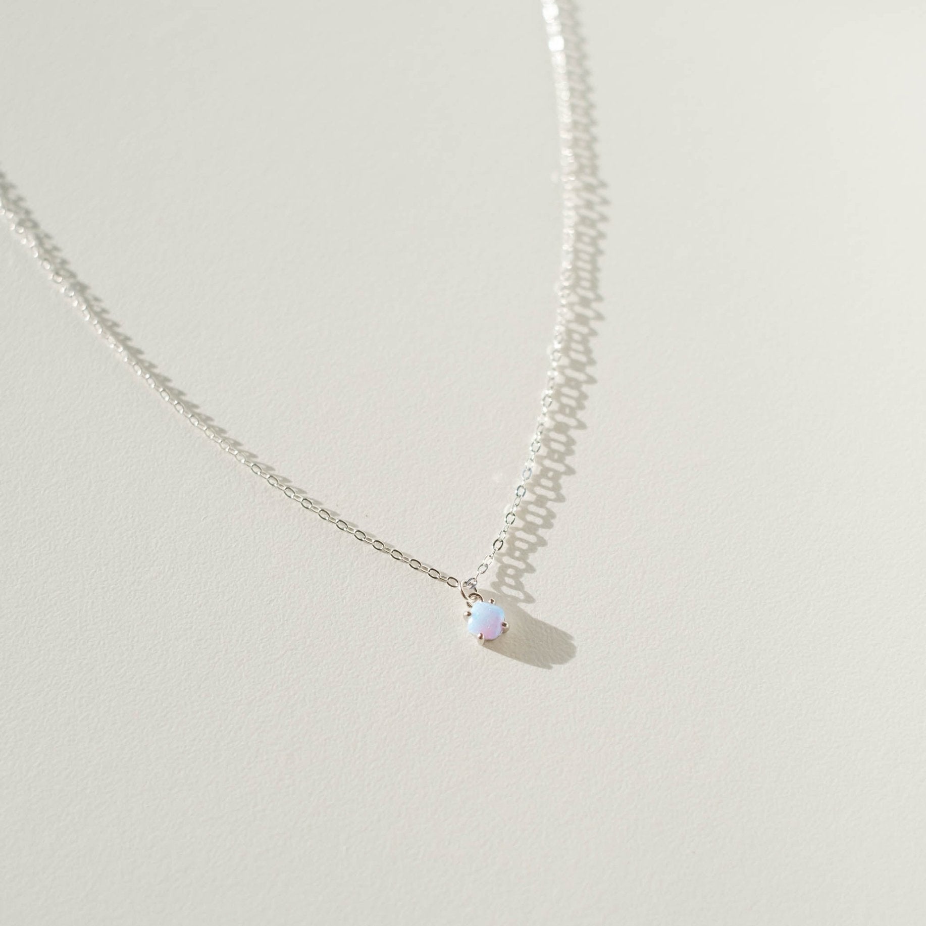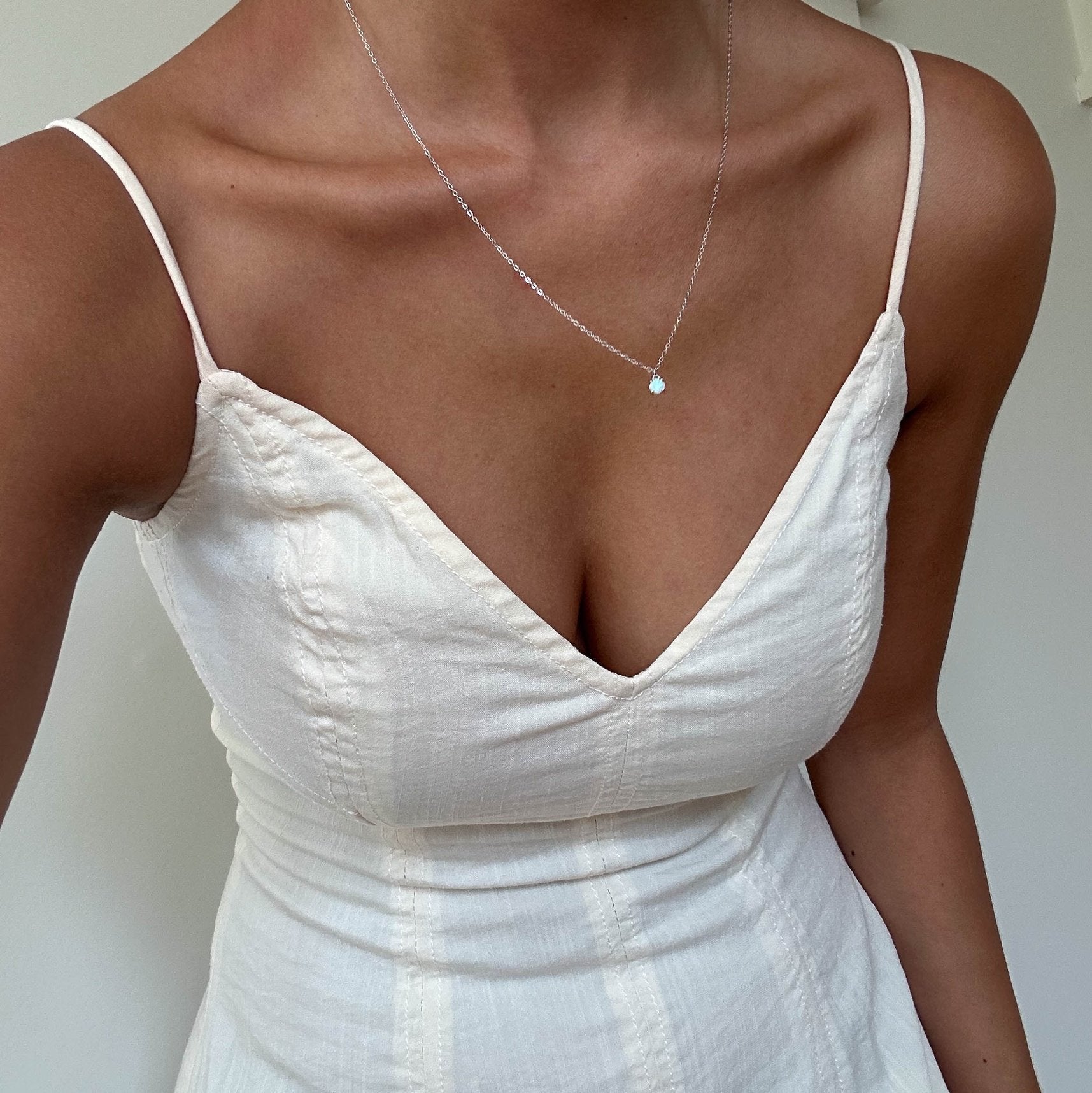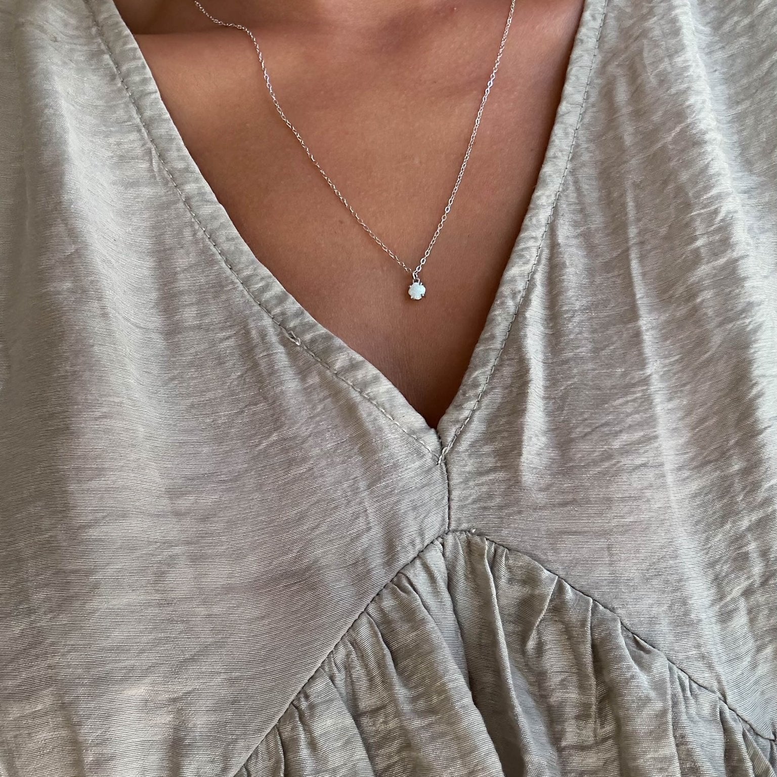 The necklace is a dainty tiny squared white opal 5mm charm, tightly clamped in a 925 silver setting. It's reflective, stunning, and blue in the sunshine, it's a perfect mood lifter.