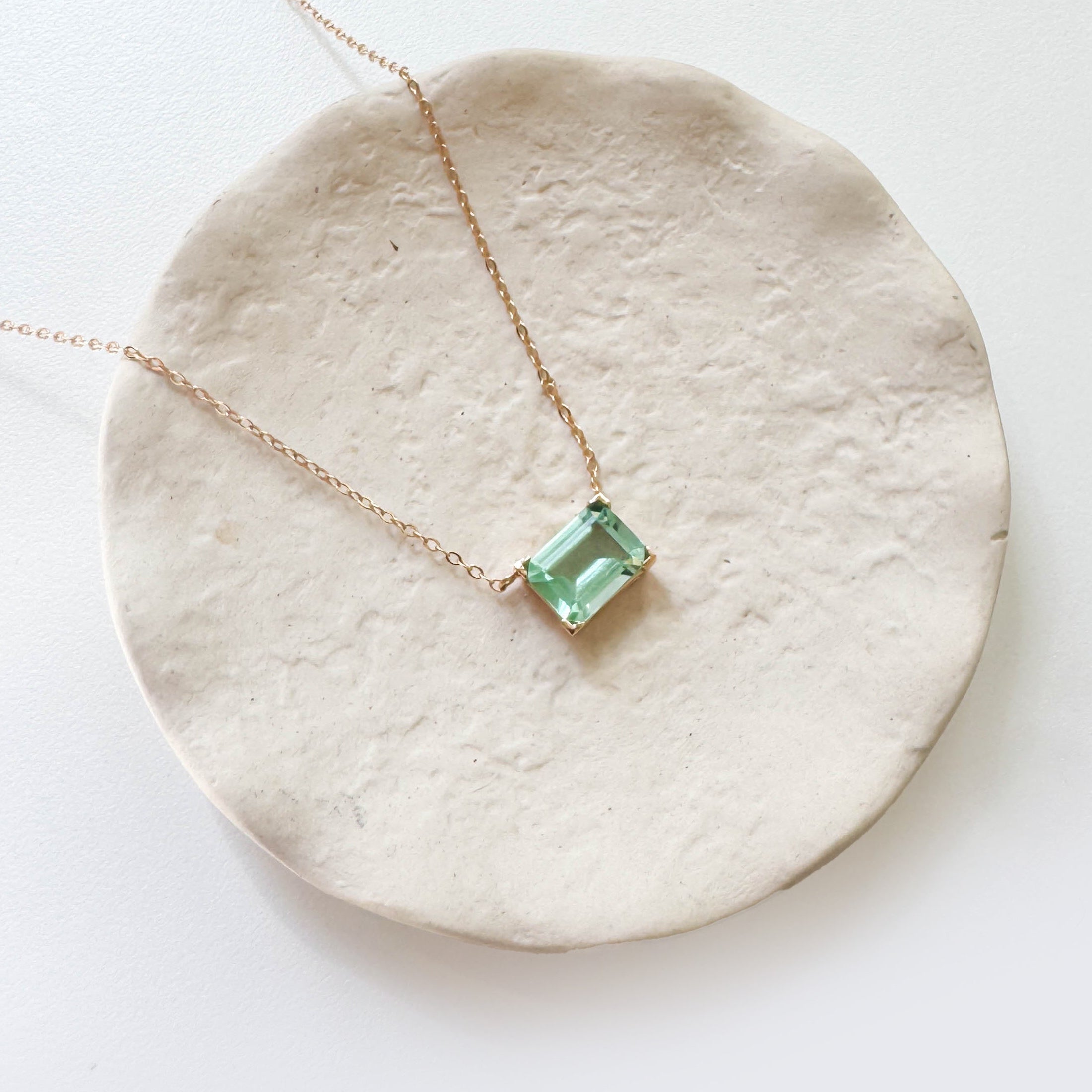 The Seafoam Glass Necklace by LLUME Jewelry features a delicate gold chain and a rectangular light green seafoam glass pendant, displayed on an off-white ceramic dish for a touch of coastal elegance.