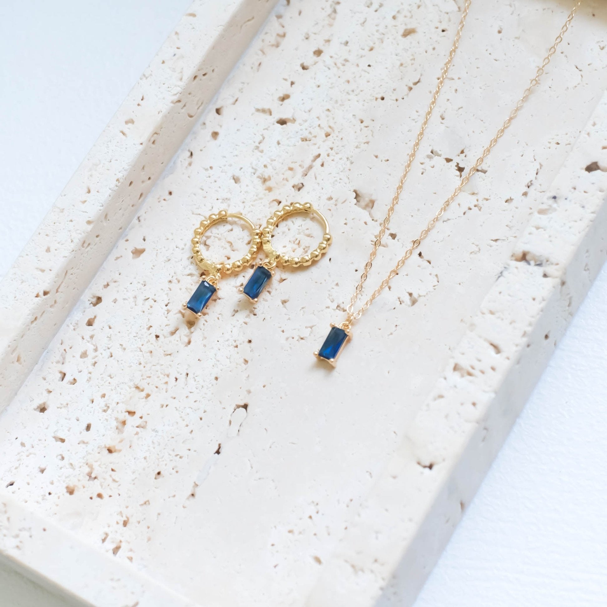Crafted with the finest materials and attention to detail, this set features a breathtaking blue pendant that sparkles and shines with every movement and a matching pair of hoops. The deep blue color symbolizes tranquility, harmony, and trust - a reminder to trust in the journey of life and have faith in the unknown.