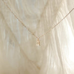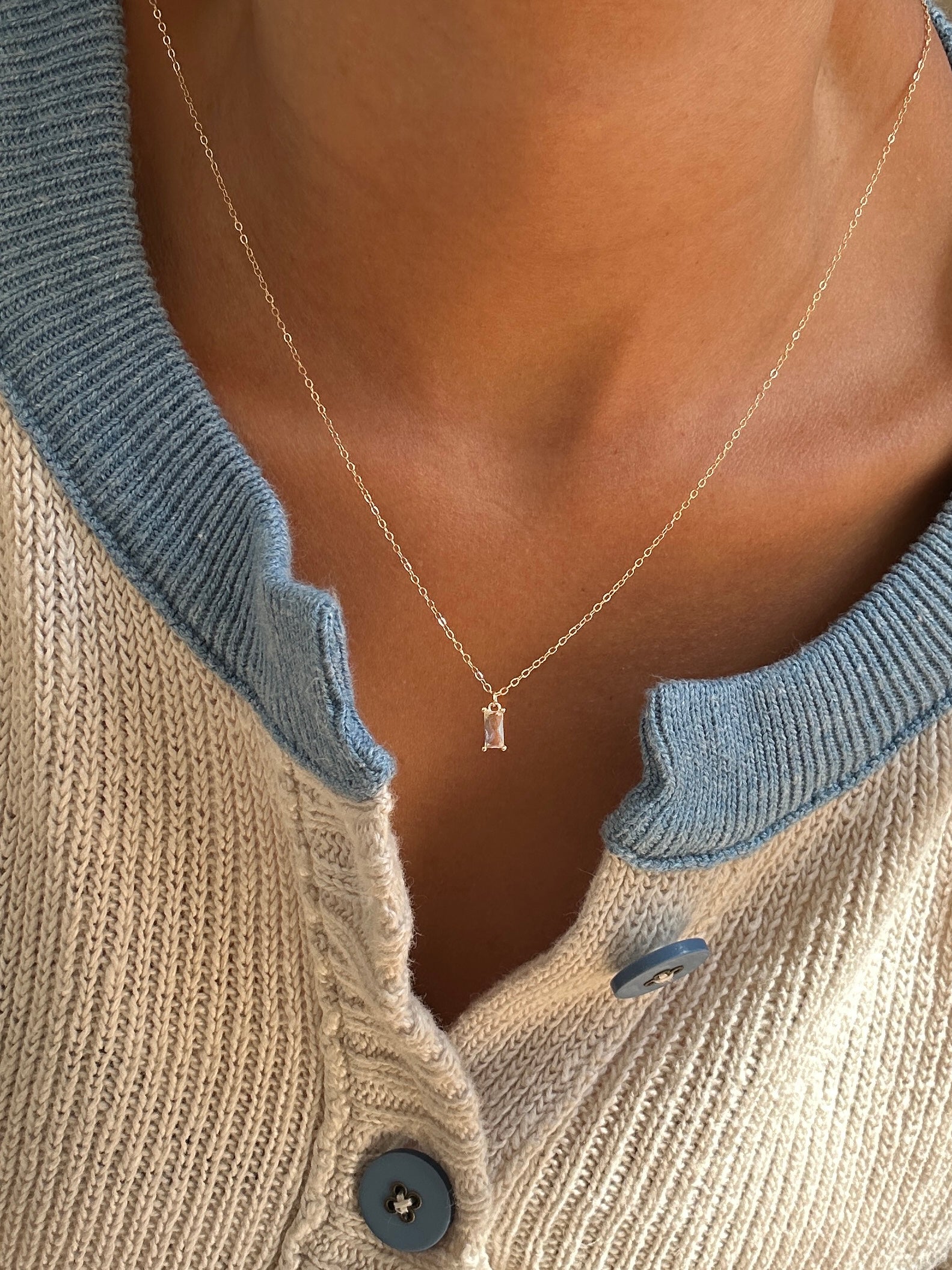 The necklace is a dainty tiny rectangle clear charm, tightly clamped in a gold setting.